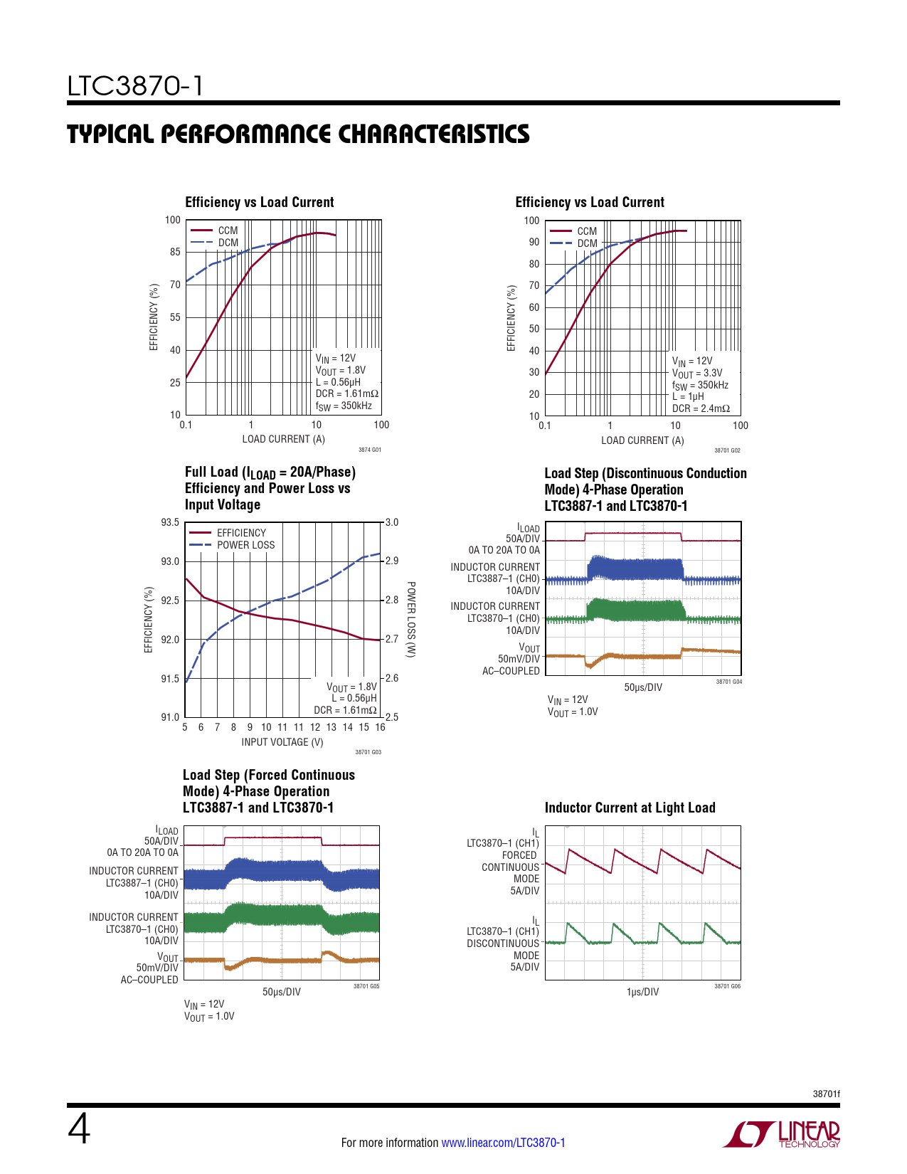 ILOAD I 50A/DIV L LTC3870–1 (CH1) 0A TO 20A TO 0A FORCED INDUCTOR CURRENT CONTINUOUS LTC3887–1 (CH0) MODE 10A/DIV 5A/DIV INDUCTOR CURRENT IL LTC3870–1 (CH0) LTC3870–1 (CH1) 10A/DIV DISCONTINUOUS VOUT MODE 50mV/DIV 5A/DIV AC–COUPLED 50µs/DIV 38701 G05 1µs/DIV 38701 G06 VIN = 12V VOUT = 1.0V 38701f 4 For more information www.linear.com/LTC3870-1 Document Outline Features Applications Typical Application Description Absolute Maximum Ratings Order Information Electrical Characteristics Pin Configuration Typical Performance Characteristics Pin Functions Block Diagram Operation Applications Information Typical Applications Package Description Typical Application Related Parts