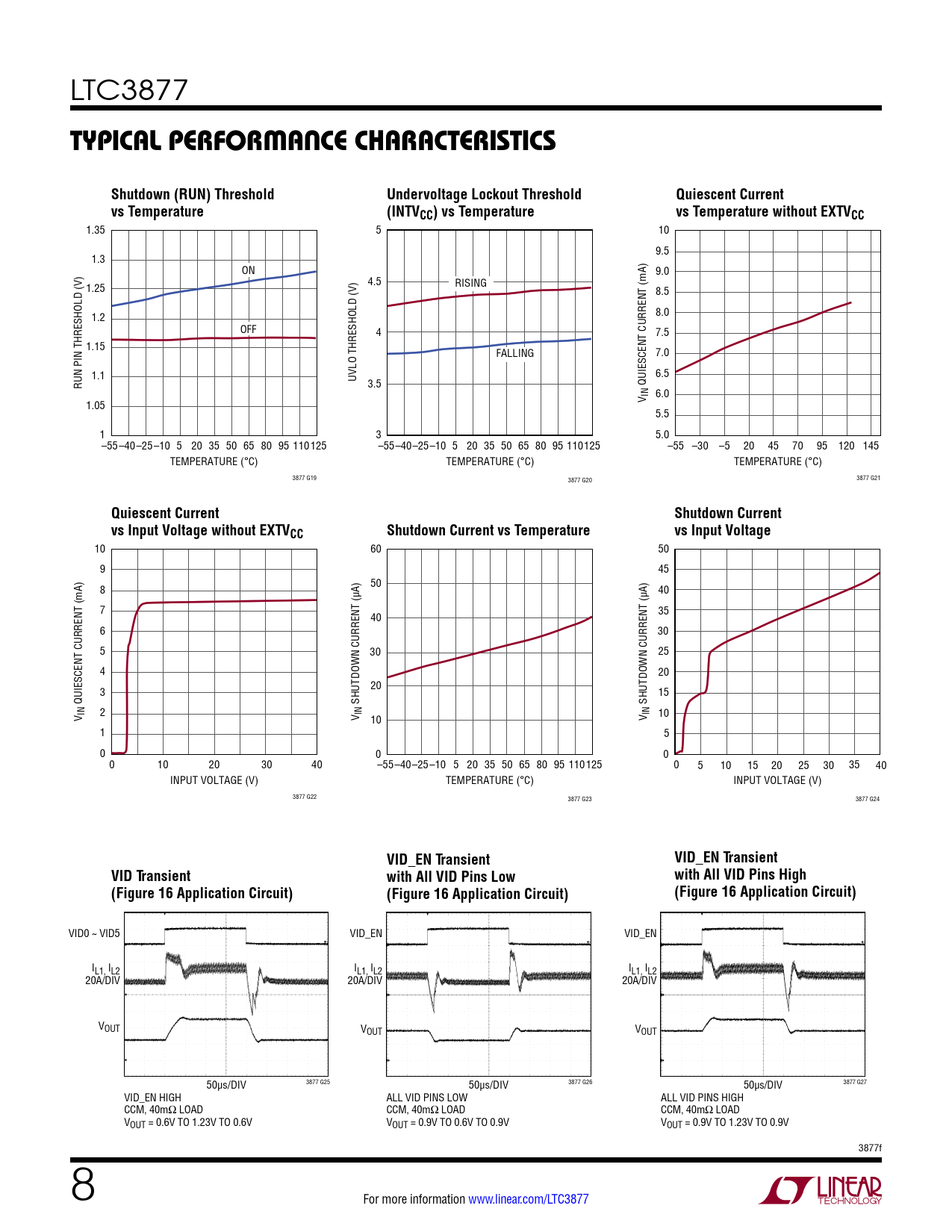 VID0 ~ VID5 VID_EN VID_EN IL1, IL2 IL1, IL2 IL1, IL2 20A/DIV 20A/DIV 20A/DIV VOUT VOUT VOUT 50µs/DIV 3877 G25 50µs/DIV 3877 G26 50µs/DIV 3877 G27 VID_EN HIGH ALL VID PINS LOW ALL VID PINS HIGH CCM, 40mΩ LOAD CCM, 40mΩ LOAD CCM, 40mΩ LOAD VOUT = 0.6V TO 1.23V TO 0.6V VOUT = 0.9V TO 0.6V TO 0.9V VOUT = 0.9V TO 1.23V TO 0.9V 3877f 8 For more information www.linear.com/LTC3877