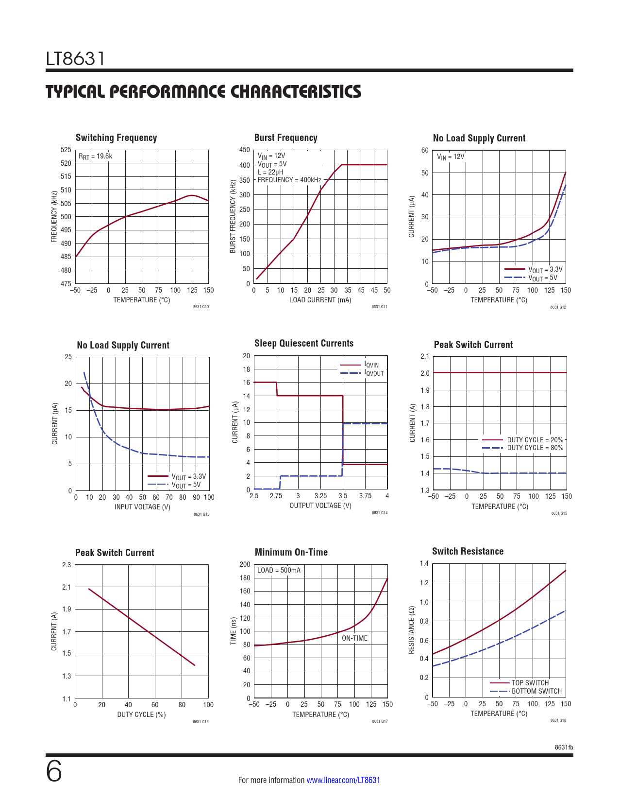 525 450 60 RRT = 19.6k VIN = 12V VIN = 12V 520 400 VOUT = 5V L = 22µH 515 50 350 FREQUENCY = 400kHz 510 300 40 505 250 500 30 200 495 CURRENT (µA) FREQUENCY (kHz) 490 150 20 BURST FREQUENCY (kHz) 485 100 10 480 50 VOUT = 3.3V VOUT = 5V 475 0 0 –50 –25 0 25 50 75 100 125 150 0 5 10 15 20 25 30 35 45 45 50 –50 –25 0 25 50 75 100 125 150 TEMPERATURE (°C) LOAD CURRENT (mA) TEMPERATURE (°C) 8631 G10 8631 G11 8631 G12