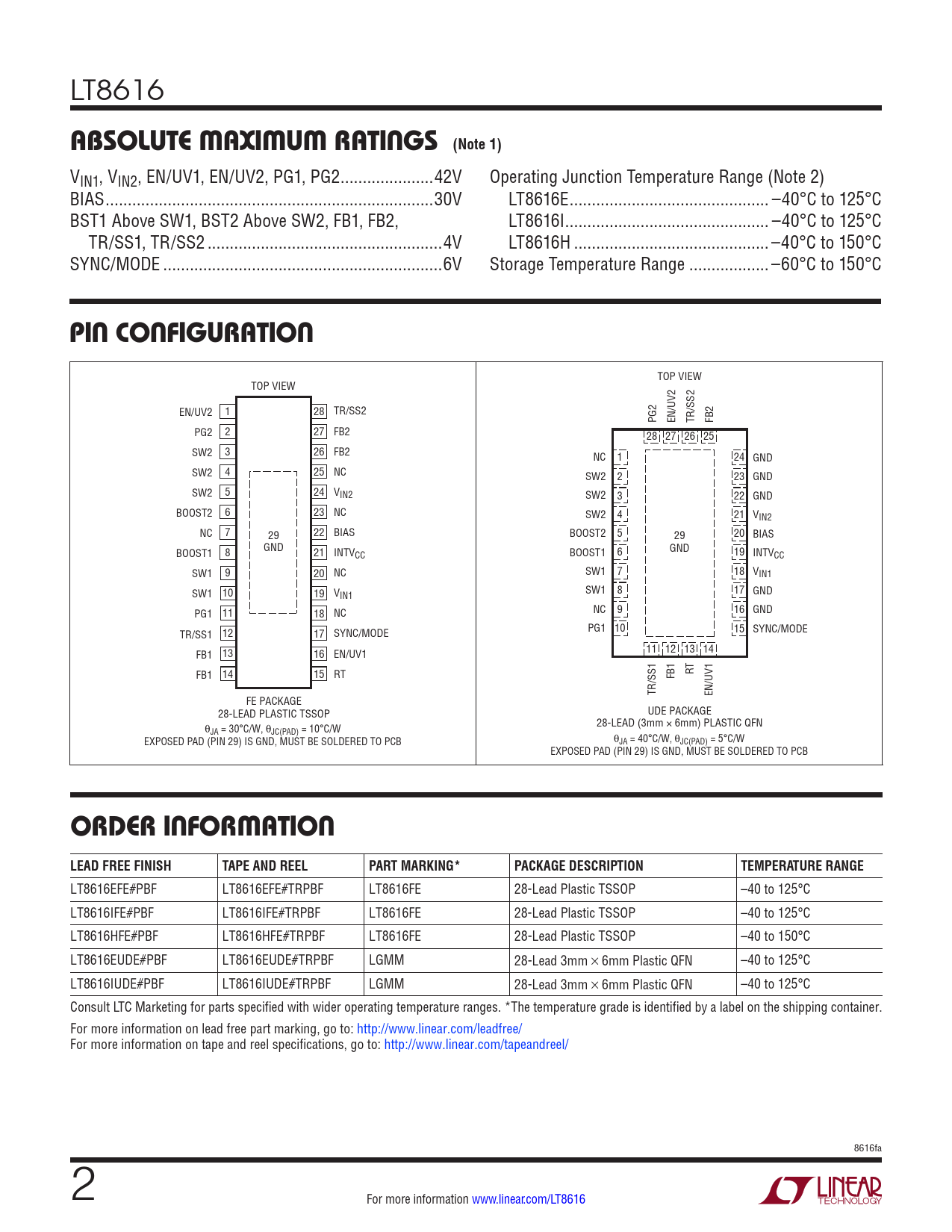 LT8616EFE#PBF LT8616EFE#TRPBF LT8616FE 28-Lead Plastic TSSOP –40 to 125°C LT8616IFE#PBF LT8616IFE#TRPBF LT8616FE 28-Lead Plastic TSSOP –40 to 125°C LT8616HFE#PBF LT8616HFE#TRPBF LT8616FE 28-Lead Plastic TSSOP –40 to 150°C LT8616EUDE#PBF LT8616EUDE#TRPBF LGMM 28-Lead 3mm × 6mm Plastic QFN –40 to 125°C LT8616IUDE#PBF LT8616IUDE#TRPBF LGMM 28-Lead 3mm × 6mm Plastic QFN –40 to 125°C Consult LTC Marketing for parts specified with wider operating temperature ranges. *The temperature grade is identified by a label on the shipping container. For more information on lead free part marking, go to: http://www.linear.com/leadfree/ For more information on tape and reel specifications, go to: http://www.linear.com/tapeandreel/ 8616fa 2 For more information www.linear.com/LT8616