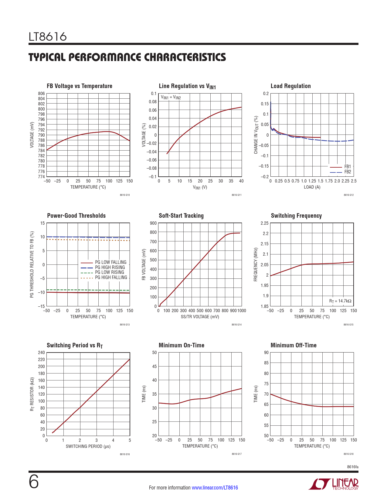 806 0.1 0.2 804 VIN1 = VIN2 802 0.08 0.15 800 0.06 798 0.1 796 0.04 794 (%) 0.02 0.05 792 OUT 790 0 0 TAGE (mV) 788 TAGE (%) –0.02 VOL 786 VOL –0.05 784 –0.04 CHANGE IN V 782 –0.1 780 –0.06 778 –0.08 –0.15 FB1 776 FB2 774 –0.1 –0.2 –50 –25 0 25 50 75 100 125 150 0 5 10 15 20 25 30 35 40 0 0.25 0.5 0.75 1.0 1.25 1.5 1.75 2.0 2.25 2.5 TEMPERATURE (°C) VIN1 (V) LOAD (A) 8616 G10 8616 G11 8616 G12