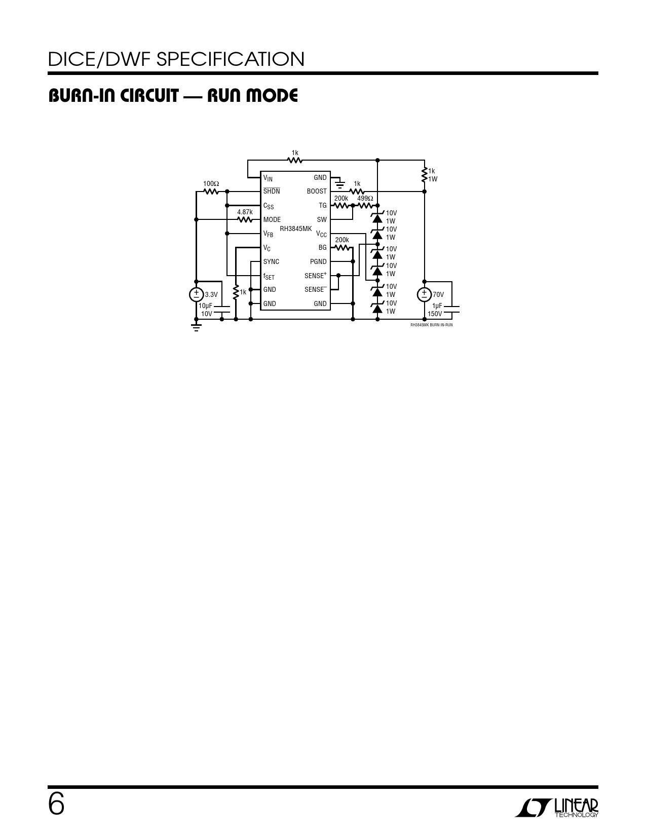 1k 1k VIN GND 1W 100Ω 1k SHDN BOOST 200k 499Ω CSS TG 4.87k 10V MODE SW 1W RH3845MK V 10V FB VCC 200k 1W VC BG 10V 1W SYNC PGND 10V f 1W SET SENSE+ + 10V 1k GND SENSE– – 3.3V 1W +– 70V 10µF GND GND 10V 1µF 10V 1W 150V RH3845MK BURN IN-RUN 6 Document Outline Description DICE Pinout Absolute Maximum Ratings Table 1: DICE/DWF Electrical Test Limits Table 2: Electrical Characteristics Table 3: Electrical Characteristics Table 4: Electrical Test Requirements Total Dose Bias Circuit — Run Mode Total Dose Bias Circuit — Shutdown Mode Burn-In Circuit — Run Mode Typical Performance Characteristics