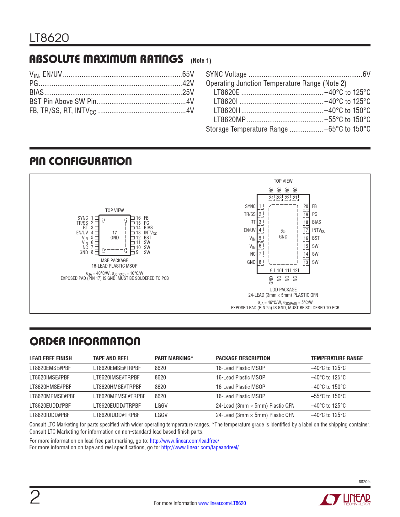 LT8620 ABSOLUTE MAXIMUM RATINGS (Note 1) VIN, EN/UV ..65V SYNC Voltage . ..6V PG ...42V Operating Junction Temperature Range (Note 2) BIAS ..25V LT8620E .. –40°C to 125°C BST Pin Above SW Pin..4V LT8620I ... –40°C to 125°C FB, TR/SS, RT, INTVCC . ..4V LT8620H .. –40°C to 150°C LT8620MP ... –55°C to 150°C Storage Temperature Range .. –65°C to 150°C PIN CONFIGURATION TOP VIEW NC NC NC NC 24 23 22 21 SYNC 1 20 FB TOP VIEW TR/SS 2 19 PG SYNC 1 16 FB TR/SS 2 15 PG RT 3 18 BIAS RT 3 14 BIAS EN/UV 4 17 13 INTV EN/UV 4 25 17 INTVCC CC V 5 IN GND 12 BST GND VIN 5 16 BST V 6 IN 11 SW NC 7 10 SW V 6 IN 15 SW GND 8 9 SW NC 7 14 SW MSE PACKAGE GND 8 13 SW 16-LEAD PLASTIC MSOP θ 9 10 11 12 JA = 40°C/W, θJC(PAD) = 10°C/W EXPOSED PAD (PIN 17) IS GND, MUST BE SOLDERED TO PCB NC NC NC GND UDD PACKAGE 24-LEAD (3mm × 5mm) PLASTIC QFN θJA = 46°C/W, θJC(PAD) = 5°C/W EXPOSED PAD (PIN 25) IS GND, MUST BE SOLDERED TO PCB ORDER INFORMATION LEAD FREE FINISHTAPE AND REELPART MARKING*PACKAGE DESCRIPTIONTEMPERATURE RANGE LT8620EMSE#PBF LT8620EMSE#TRPBF 8620 16-Lead Plastic MSOP –40°C to 125°C LT8620IMSE#PBF LT8620IMSE#TRPBF 8620 16-Lead Plastic MSOP –40°C to 125°C LT8620HMSE#PBF LT8620HMSE#TRPBF 8620 16-Lead Plastic MSOP –40°C to 150°C LT8620MPMSE#PBF LT8620MPMSE#TRPBF 8620 16-Lead Plastic MSOP –55°C to 150°C LT8620EUDD#PBF LT8620EUDD#TRPBF LGGV 24-Lead (3mm × 5mm) Plastic QFN –40°C to 125°C LT8620IUDD#PBF LT8620IUDD#TRPBF LGGV 24-Lead (3mm × 5mm) Plastic QFN –40°C to 125°C Consult LTC Marketing for parts specified with wider operating temperature ranges. *The temperature grade is identified by a label on the shipping container. Consult LTC Marketing for information on non-standard lead based finish parts. For more information on lead free part marking, go to: http://www.linear.com/leadfree/ For more information on tape and reel specifications, go to: http://www.linear.com/tapeandreel/ 8620fa 2 For more information www.linear.com/LT8620 Document Outline Features Applications Description Typical Application Absolute Maximum Ratings Pin Configuration Order Information Electrical Characteristics Typical Performance Characteristics Pin Functions Block Diagram Operation Applications Information Typical Applications Package Description Typical Application Related Parts