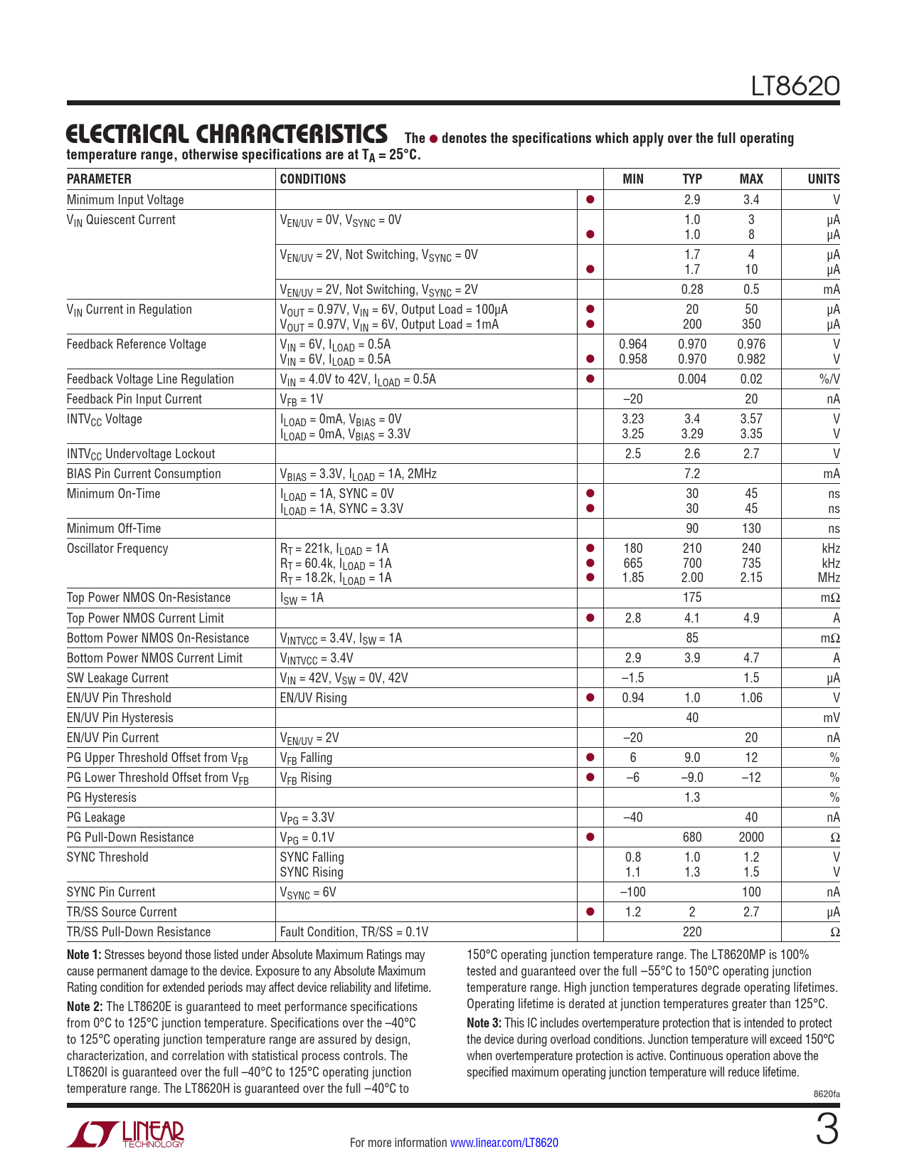 The LT8620E is guaranteed to meet performance specifications Operating lifetime is derated at junction temperatures greater than 125°C. from 0°C to 125°C junction temperature. Specifications over the –40°C