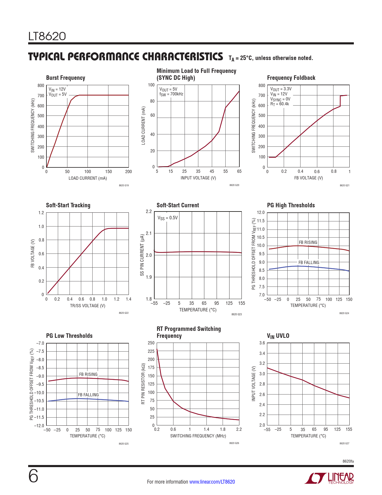 1.2 2.2 12.0 VSS = 0.5V 11.5 1.0 (%) REF 11.0 2.1 0.8 10.5 FB RISING 10.0 0.6 2.0 9.5 9.0 FB FALLING FB VOLTAGE (V) 0.4 8.5 SS PIN CURRENT (µA) 1.9 0.2 8.0 PG THRESHOLD OFFSET FROM V 7.5 0 7.0 0 0.2 0.4 0.6 0.8 1.0 1.2 1.4 1.8 –50 –25 0 25 50 75 100 125 150 TR/SS VOLTAGE (V) –55 –25 5 35 65 95 125 155 TEMPERATURE (°C) TEMPERATURE (°C) 8620 G22 8620 G23 8620 G24