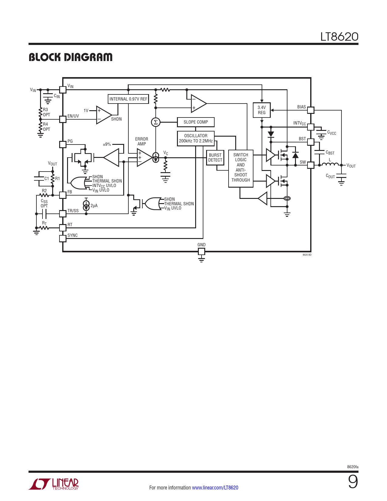 VIN VIN CIN – INTERNAL 0.97V REF + 3.4V BIAS R3 1V + REG OPT EN/UV – SHDN SLOPE COMP INTV R4 CC OPT C OSCILLATOR VCC ERROR PG 200kHz TO 2.2MHz BST ±9% AMP + V C + C BURST BST SWITCH V – DETECT LOGIC SW L OUT AND VOUT ANTI- SHOOT SHDN COUT C1 R1 THERMAL SHDN THROUGH INTVCC UVLO R2 VIN UVLO FB SHDN CSS THERMAL SHDN OPT 2µA VIN UVLO TR/SS RT RT SYNC GND 8620 BD 8620fa For more information www.linear.com/LT8620 9 Document Outline Features Applications Description Typical Application Absolute Maximum Ratings Pin Configuration Order Information Electrical Characteristics Typical Performance Characteristics Pin Functions Block Diagram Operation Applications Information Typical Applications Package Description Typical Application Related Parts