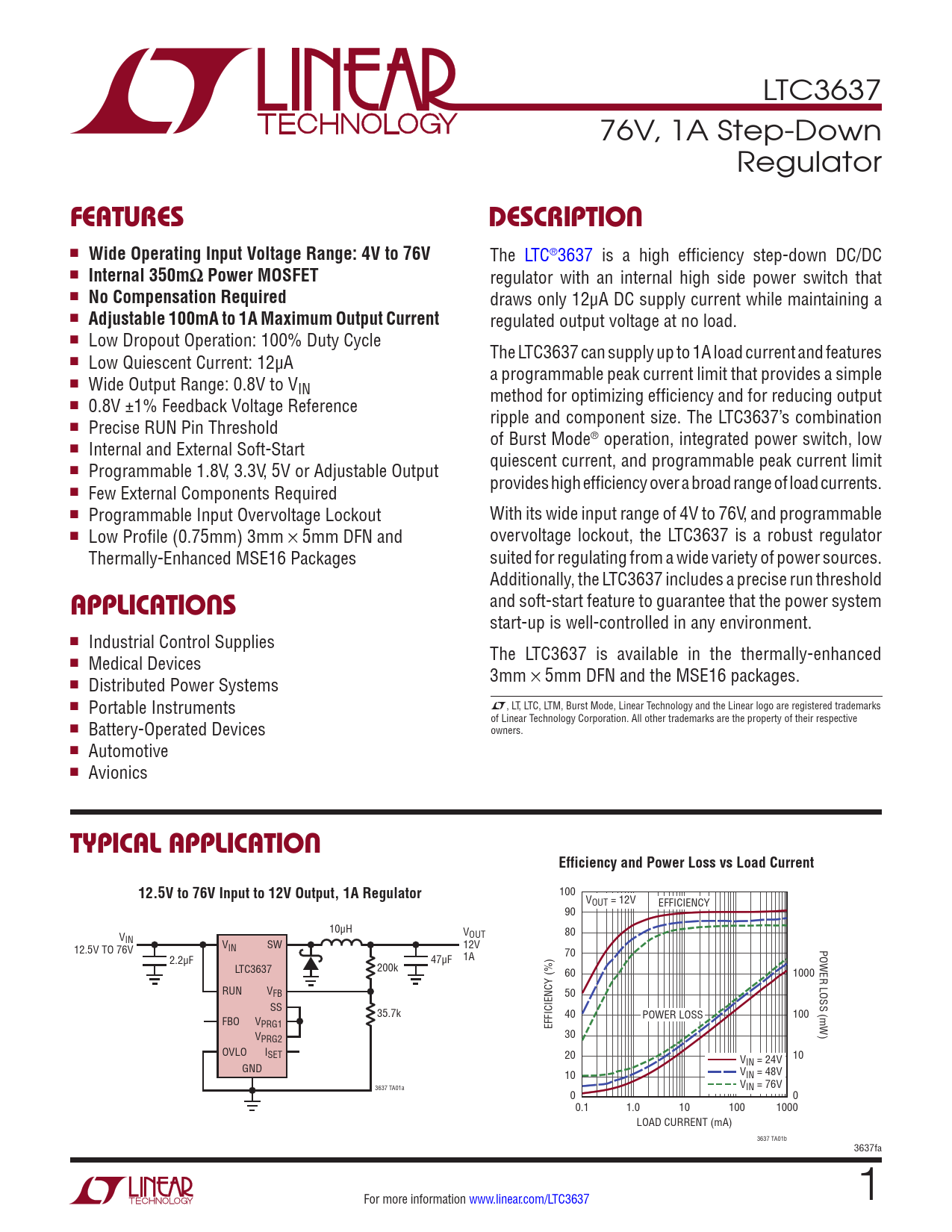 LTC3637 76V, 1A Step-Down Regulator