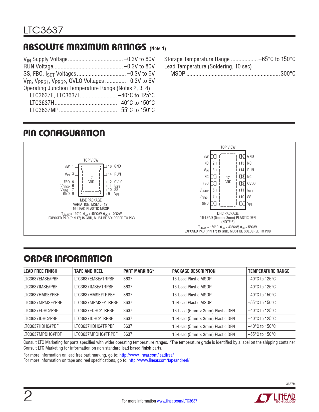 LTC3637EMSE#PBF LTC3637EMSE#TRPBF 3637 16-Lead Plastic MSOP –40°C to 125°C LTC3637IMSE#PBF LTC3637IMSE#TRPBF 3637 16-Lead Plastic MSOP –40°C to 125°C LTC3637HMSE#PBF LTC3637HMSE#TRPBF 3637 16-Lead Plastic MSOP –40°C to 150°C LTC3637MPMSE#PBF LTC3637MPMSE#TRPBF 3637 16-Lead Plastic MSOP –55°C to 150°C LTC3637EDHC#PBF LTC3637EDHC#TRPBF 3637 16-Lead (5mm × 3mm) Plastic DFN –40°C to 125°C LTC3637IDHC#PBF LTC3637IDHC#TRPBF 3637 16-Lead (5mm × 3mm) Plastic DFN –40°C to 125°C LTC3637HDHC#PBF LTC3637HDHC#TRPBF 3637 16-Lead (5mm × 3mm) Plastic DFN –40°C to 150°C LTC3637MPDHC#PBF LTC3637MPDHC#TRPBF 3637 16-Lead (5mm × 3mm) Plastic DFN –55°C to 150°C Consult LTC Marketing for parts specified with wider operating temperature ranges. *The temperature grade is identified by a label on the shipping container. Consult LTC Marketing for information on non-standard lead based finish parts. For more information on lead free part marking, go to: http://www.linear.com/leadfree/ For more information on tape and reel specifications, go to: http://www.linear.com/tapeandreel/ 3637fa 2 For more information www.linear.com/LTC3637 Document Outline Features Applications Description Typical Application Absolute Maximum Ratings Pin Configuration Order Information Electrical Characteristics Typical Performance Characteristics Pin Functions Block Diagram Operation Applications Information Typical Applications Package Description Typical Application Related Parts