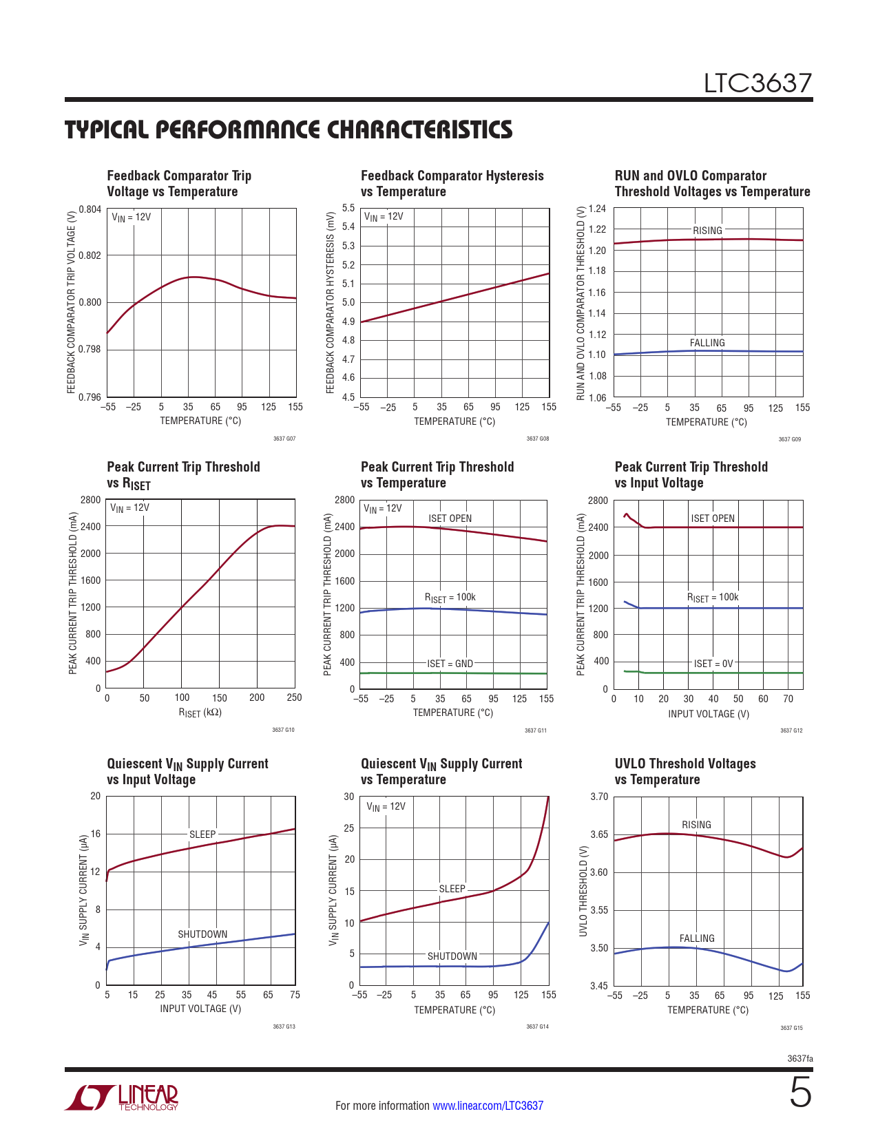 0.804 5.5 1.24 VIN = 12V VIN = 12V 5.4 1.22 RISING 5.3 0.802 1.20 5.2 1.18 5.1 1.16 0.800 5.0 1.14 4.9 4.8 1.12 0.798 FALLING 4.7 1.10 4.6 1.08 FEEDBACK COMPARATOR TRIP VOLTAGE (V) FEEDBACK COMPARATOR HYSTERESIS (mV) 0.796 4.5 RUN AND OVLO COMPARATOR THRESHOLD (V) 1.06 –55 –25 5 35 65 95 125 155 –55 –25 5 35 65 95 125 155 –55 –25 5 35 65 95 125 155 TEMPERATURE (°C) TEMPERATURE (°C) TEMPERATURE (°C) 3637 G07 3637 G08 3637 G09