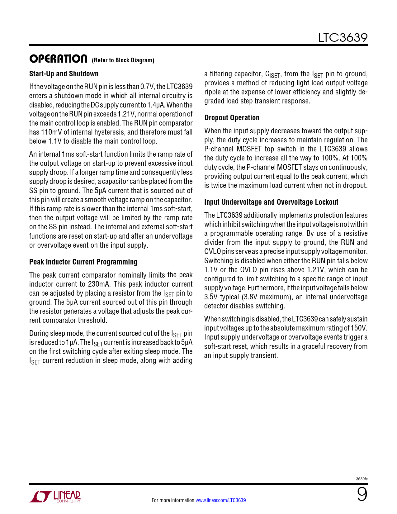 LTC3639 OPERATION (Refer to Block Diagram) Start-Up and Shutdown a filtering capacitor, CISET, from the ISET pin to ground, If the voltage on the RUN pin is less than 0.7V, the LTC3639 provides a method of reducing light load output voltage enters a shutdown mode in which all internal circuitry is ripple at the expense of lower efficiency and slightly de- disabled, reducing the DC supply current to 1.4µA. When the graded load step transient response. voltage on the RUN pin exceeds 1.21V, normal operation of Dropout Operation the main control loop is enabled. The RUN pin comparator has 110mV of internal hysteresis, and therefore must fall When the input supply decreases toward the output sup- below 1.1V to disable the main control loop. ply, the duty cycle increases to maintain regulation. The P-channel MOSFET top switch in the LTC3639 allows An internal 1ms soft-start function limits the ramp rate of the duty cycle to increase all the way to 100%. At 100% the output voltage on start-up to prevent excessive input duty cycle, the P-channel MOSFET stays on continuously, supply droop. If a longer ramp time and consequently less providing output current equal to the peak current, which supply droop is desired, a capacitor can be placed from the is twice the maximum load current when not in dropout. SS pin to ground. The 5µA current that is sourced out of this pin will create a smooth voltage ramp on the capacitor. Input Undervoltage and Overvoltage Lockout If this ramp rate is slower than the internal 1ms soft-start, then the output voltage will be limited by the ramp rate The LTC3639 additionally implements protection features on the SS pin instead. The internal and external soft-start which inhibit switching when the input voltage is not within functions are reset on start-up and after an undervoltage a programmable operating range. By use of a resistive or overvoltage event on the input supply. divider from the input supply to ground, the RUN and OVLO pins serve as a precise input supply voltage monitor. Peak Inductor Current Programming Switching is disabled when either the RUN pin falls below 1.1V or the OVLO pin rises above 1.21V, which can be The peak current comparator nominally limits the peak configured to limit switching to a specific range of input inductor current to 230mA. This peak inductor current supply voltage. Furthermore, if the input voltage falls below can be adjusted by placing a resistor from the ISET pin to 3.5V typical (3.8V maximum), an internal undervoltage ground. The 5µA current sourced out of this pin through detector disables switching. the resistor generates a voltage that adjusts the peak cur- rent comparator threshold. When switching is disabled, the LTC3639 can safely sustain input voltages up to the absolute maximum rating of 150V. During sleep mode, the current sourced out of the ISET pin Input supply undervoltage or overvoltage events trigger a is reduced to 1µA. The ISET current is increased back to 5µA soft-start reset, which results in a graceful recovery from on the first switching cycle after exiting sleep mode. The an input supply transient. ISET current reduction in sleep mode, along with adding 3639fc For more information www.linear.com/LTC3639 9 Document Outline Features Applications Description Typical Application Absolute Maximum Ratings Pin Configuration Order Information Electrical Characteristics Typical Performance Characteristics Pin Functions Block Diagram Operation Applications Information Typical Applications Package Description Revision History Typical Application Related Parts