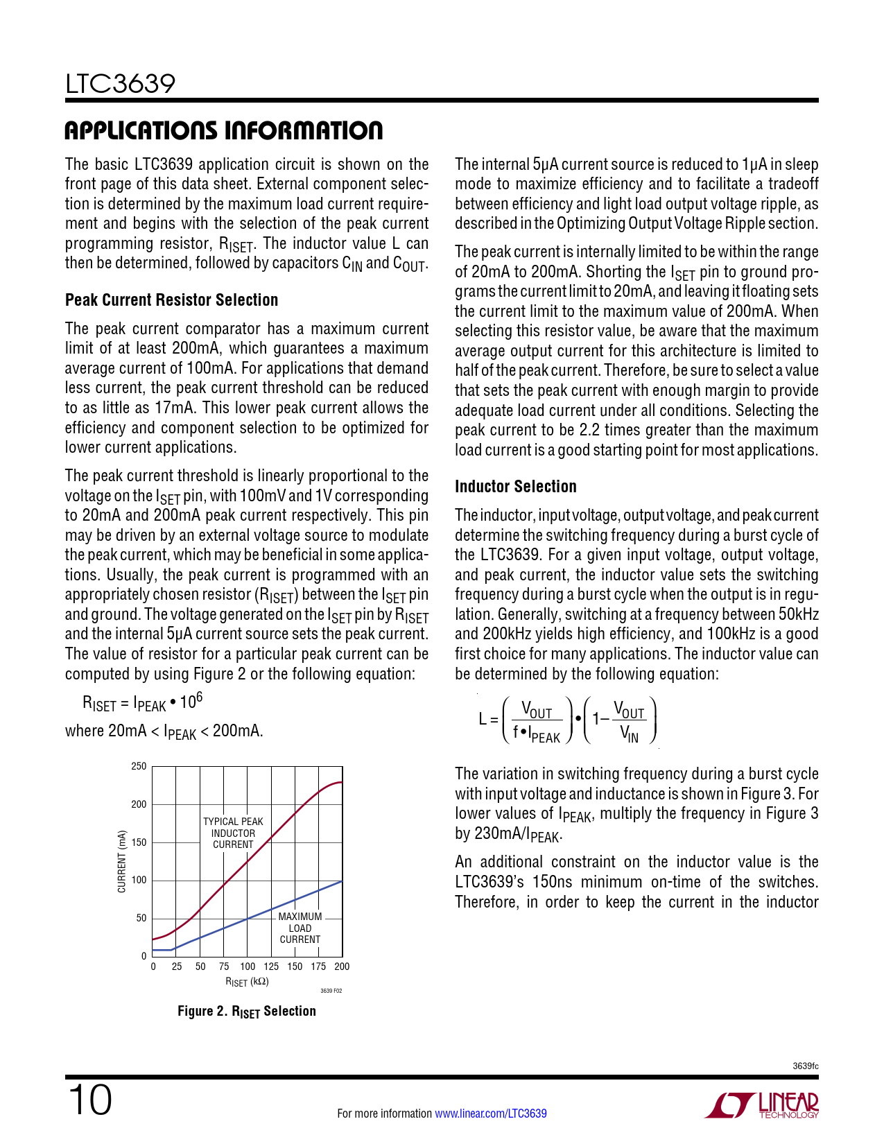 LTC3639 APPLICATIONS INFORMATION The basic LTC3639 application circuit is shown on the The internal 5μA current source is reduced to 1μA in sleep front page of this data sheet. External component selec- mode to maximize efficiency and to facilitate a tradeoff tion is determined by the maximum load current require- between efficiency and light load output voltage ripple, as ment and begins with the selection of the peak current described in the Optimizing Output Voltage Ripple section. programming resistor, RISET. The inductor value L can The peak current is internally limited to be within the range then be determined, followed by capacitors CIN and COUT. of 20mA to 200mA. Shorting the ISET pin to ground pro- Peak Current Resistor Selection grams the current limit to 20mA, and leaving it floating sets the current limit to the maximum value of 200mA. When The peak current comparator has a maximum current selecting this resistor value, be aware that the maximum limit of at least 200mA, which guarantees a maximum average output current for this architecture is limited to average current of 100mA. For applications that demand half of the peak current. Therefore, be sure to select a value less current, the peak current threshold can be reduced that sets the peak current with enough margin to provide to as little as 17mA. This lower peak current allows the adequate load current under all conditions. Selecting the efficiency and component selection to be optimized for peak current to be 2.2 times greater than the maximum lower current applications. load current is a good starting point for most applications. The peak current threshold is linearly proportional to the voltage on the I Inductor Selection SET pin, with 100mV and 1V corresponding to 20mA and 200mA peak current respectively. This pin The inductor, input voltage, output voltage, and peak current may be driven by an external voltage source to modulate determine the switching frequency during a burst cycle of the peak current, which may be beneficial in some applica- the LTC3639. For a given input voltage, output voltage, tions. Usually, the peak current is programmed with an and peak current, the inductor value sets the switching appropriately chosen resistor (RISET) between the ISET pin frequency during a burst cycle when the output is in regu- and ground. The voltage generated on the ISET pin by RISET lation. Generally, switching at a frequency between 50kHz and the internal 5µA current source sets the peak current. and 200kHz yields high efficiency, and 100kHz is a good The value of resistor for a particular peak current can be first choice for many applications. The inductor value can computed by using Figure 2 or the following equation: be determined by the following equation: RISET = IPEAK • 106 V V L = OUT OUT where 20mA < IPEAK < 200mA. f •I • 1– V PEAK IN 250 The variation in switching frequency during a burst cycle with input voltage and inductance is shown in Figure 3. For 200 lower values of I TYPICAL PEAK PEAK, multiply the frequency in Figure 3 INDUCTOR by 230mA/I 150 PEAK. CURRENT An additional constraint on the inductor value is the 100 LTC3639’s 150ns minimum on-time of the switches. CURRENT (mA) Therefore, in order to keep the current in the inductor 50 MAXIMUM LOAD CURRENT 0 0 25 50 75 100 125 150 175 200 RISET (kΩ) 3639 F02 Figure 2. RISET Selection 3639fc 10 For more information www.linear.com/LTC3639 Document Outline Features Applications Description Typical Application Absolute Maximum Ratings Pin Configuration Order Information Electrical Characteristics Typical Performance Characteristics Pin Functions Block Diagram Operation Applications Information Typical Applications Package Description Revision History Typical Application Related Parts