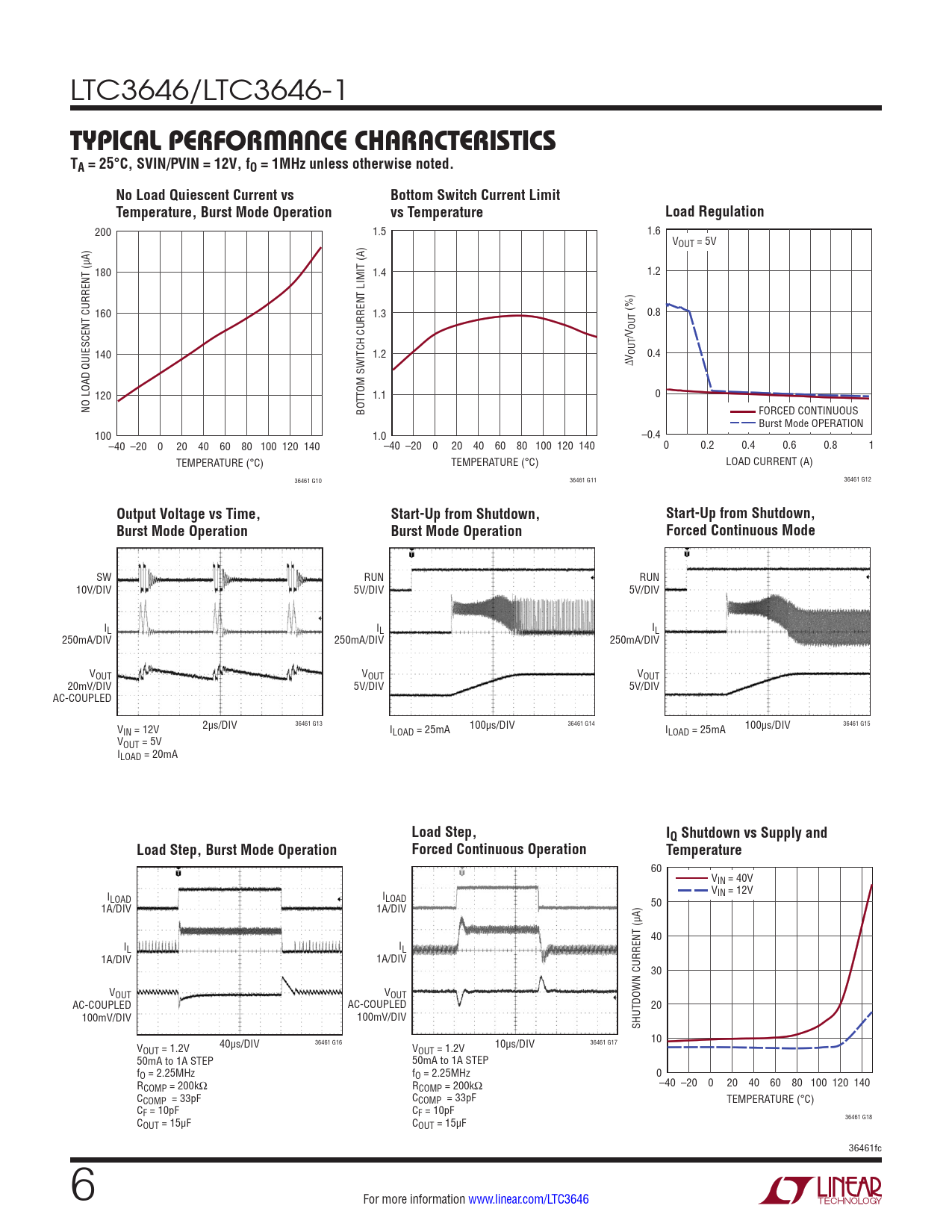200 1.5 1.6 VOUT = 5V 180 1.4 1.2 160 1.3 (%) 0.8 OUT/V 140 1.2 OUT 0.4 ∆V 120 TOM SWITCH CURRENT LIMIT (A) 1.1 0 NO LOAD QUIESCENT CURRENT (µA) BOT FORCED CONTINUOUS Burst Mode OPERATION 100 1.0 –0.4 –40 –20 0 20 40 60 80 100 120 140 –40 –20 0 20 40 60 80 100 120 140 0 0.2 0.4 0.6 0.8 1 TEMPERATURE (°C) TEMPERATURE (°C) LOAD CURRENT (A) 36461 G10 36461 G11 36461 G12