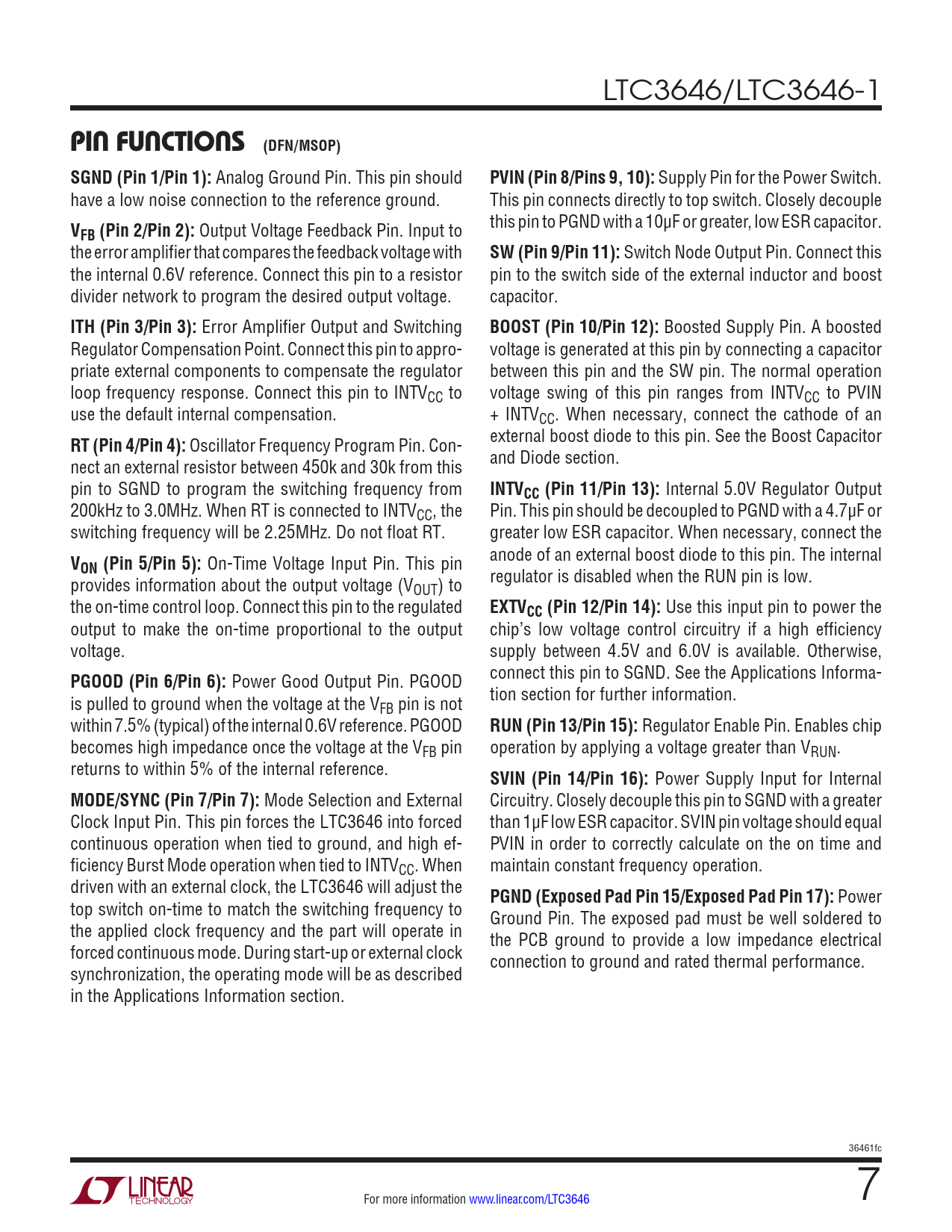 LTC3646/LTC3646-1 PIN FUNCTIONS (DFN/MSOP)SGND (Pin 1/Pin 1): Analog Ground Pin. This pin should PVIN (Pin 8/Pins 9, 10): Supply Pin for the Power Switch. have a low noise connection to the reference ground. This pin connects directly to top switch. Closely decouple V this pin to PGND with a 10µF or greater, low ESR capacitor. FB (Pin 2/Pin 2): Output Voltage Feedback Pin. Input to the error amplifier that compares the feedback voltage with SW (Pin 9/Pin 11): Switch Node Output Pin. Connect this the internal 0.6V reference. Connect this pin to a resistor pin to the switch side of the external inductor and boost divider network to program the desired output voltage. capacitor. ITH (Pin 3/Pin 3): Error Amplifier Output and Switching BOOST (Pin 10/Pin 12): Boosted Supply Pin. A boosted Regulator Compensation Point. Connect this pin to appro- voltage is generated at this pin by connecting a capacitor priate external components to compensate the regulator between this pin and the SW pin. The normal operation loop frequency response. Connect this pin to INTVCC to voltage swing of this pin ranges from INTVCC to PVIN use the default internal compensation. + INTVCC. When necessary, connect the cathode of an RT (Pin 4/Pin 4): Oscillator Frequency Program Pin. Con- external boost diode to this pin. See the Boost Capacitor nect an external resistor between 450k and 30k from this and Diode section. pin to SGND to program the switching frequency from INTVCC (Pin 11/Pin 13): Internal 5.0V Regulator Output 200kHz to 3.0MHz. When RT is connected to INTVCC, the Pin. This pin should be decoupled to PGND with a 4.7µF or switching frequency will be 2.25MHz. Do not float RT. greater low ESR capacitor. When necessary, connect the V anode of an external boost diode to this pin. The internal ON (Pin 5/Pin 5): On-Time Voltage Input Pin. This pin provides information about the output voltage (V regulator is disabled when the RUN pin is low. OUT) to the on-time control loop. Connect this pin to the regulated EXTVCC (Pin 12/Pin 14): Use this input pin to power the output to make the on-time proportional to the output chip’s low voltage control circuitry if a high efficiency voltage. supply between 4.5V and 6.0V is available. Otherwise, PGOOD (Pin 6/Pin 6): Power Good Output Pin. PGOOD connect this pin to SGND. See the Applications Informa- is pulled to ground when the voltage at the V tion section for further information. FB pin is not within 7.5% (typical) of the internal 0.6V reference. PGOOD RUN (Pin 13/Pin 15): Regulator Enable Pin. Enables chip becomes high impedance once the voltage at the VFB pin operation by applying a voltage greater than VRUN. returns to within 5% of the internal reference. SVIN (Pin 14/Pin 16): Power Supply Input for Internal MODE/SYNC (Pin 7/Pin 7): Mode Selection and External Circuitry. Closely decouple this pin to SGND with a greater Clock Input Pin. This pin forces the LTC3646 into forced than 1µF low ESR capacitor. SVIN pin voltage should equal continuous operation when tied to ground, and high ef- PVIN in order to correctly calculate on the on time and ficiency Burst Mode operation when tied to INTVCC. When maintain constant frequency operation. driven with an external clock, the LTC3646 will adjust the PGND (Exposed Pad Pin 15/Exposed Pad Pin 17): Power top switch on-time to match the switching frequency to Ground Pin. The exposed pad must be well soldered to the applied clock frequency and the part will operate in the PCB ground to provide a low impedance electrical forced continuous mode. During start-up or external clock connection to ground and rated thermal performance. synchronization, the operating mode will be as described in the Applications Information section. 36461fc For more information www.linear.com/LTC3646 7 Document Outline Features Applications Description Typical Application Absolute Maximum Ratings Pin Configuration Order Information Electrical Characteristics Typical Performance Characteristics Pin Functions Functional Block Diagram Operation Applications Information Typical Applications Typical Application Related Parts