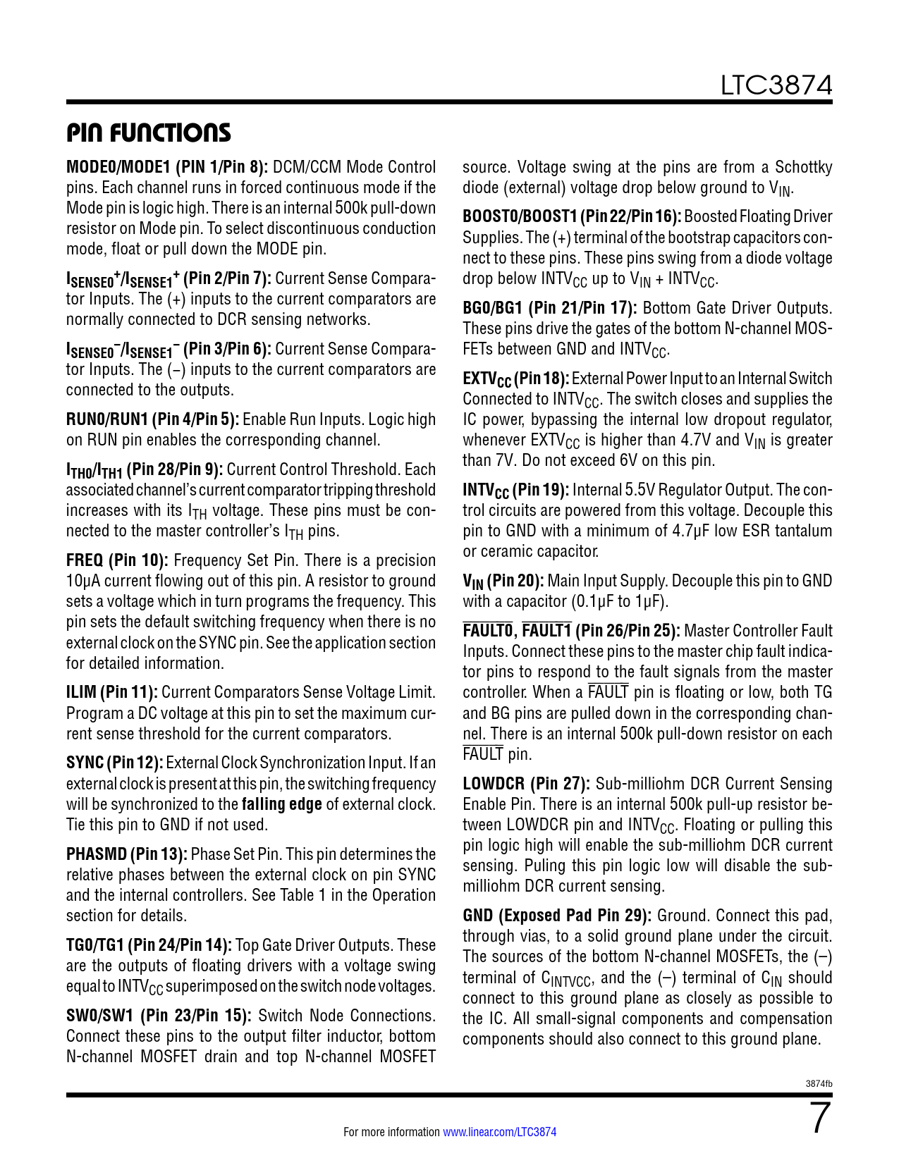 Switch Node Connections. the IC. All small-signal components and compensation Connect these pins to the output filter inductor, bottom components should also connect to this ground plane. N-channel MOSFET drain and top N-channel MOSFET 3874fb For more information www.linear.com/LTC3874 7 Document Outline Features Applications Description Typical Application Absolute Maximum Ratings Pin Configuration Order Information Electrical Characteristics Typical Performance Characteristics Pin Functions Functional Block Diagram Operation Applications Information Package Description Typical Application Related Parts Features Applications Typical Application Description Absolute Maximum Ratings Order Information Pin Configuration Electrical Characteristics Typical Performance Characteristics Pin Functions Functional Block Diagram Operation Applications Information Package Description Revision History Typical Application Related Parts