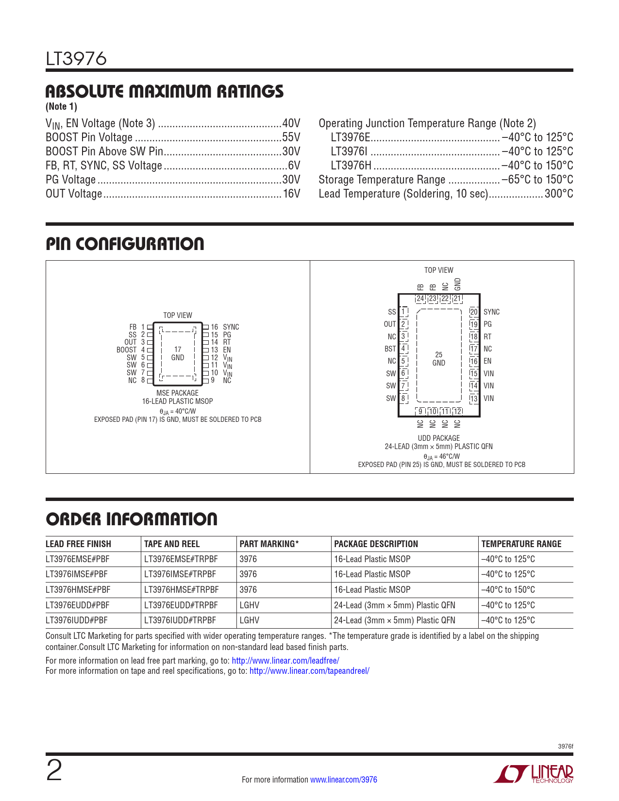 LT3976EMSE#PBF LT3976EMSE#TRPBF 3976 16-Lead Plastic MSOP –40°C to 125°C LT3976IMSE#PBF LT3976IMSE#TRPBF 3976 16-Lead Plastic MSOP –40°C to 125°C LT3976HMSE#PBF LT3976HMSE#TRPBF 3976 16-Lead Plastic MSOP –40°C to 150°C LT3976EUDD#PBF LT3976EUDD#TRPBF LGHV 24-Lead (3mm × 5mm) Plastic QFN –40°C to 125°C LT3976IUDD#PBF LT3976IUDD#TRPBF LGHV 24-Lead (3mm × 5mm) Plastic QFN –40°C to 125°C Consult LTC Marketing for parts specified with wider operating temperature ranges. *The temperature grade is identified by a label on the shipping container.Consult LTC Marketing for information on non-standard lead based finish parts. For more information on lead free part marking, go to: http://www.linear.com/leadfree/ For more information on tape and reel specifications, go to: http://www.linear.com/tapeandreel/ 3976f 2 For more information www.linear.com/3976 Document Outline Features Applications Description Typical Application Absolute Maximum Ratings Pin Configuration Order Information Electrical Characteristics Typical Performance Characteristics Pin Functions Block Diagram Operation Applications Information Typical Applications Package Description Typical Application Related Parts