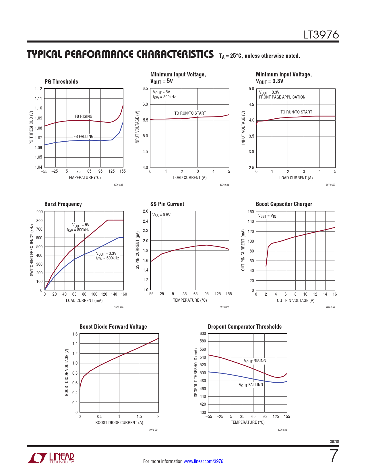 1.12 6.5 5.0 VOUT = 5V VOUT = 3.3V 1.11 fSW = 800kHz FRONT PAGE APPLICATION 6.0 4.5 1.10 TO RUN/TO START TO RUN/TO START 1.09 FB RISING 5.5 4.0 1.08 1.07 FB FALLING 5.0 3.5 PG THRESHOLD (V) INPUT VOLTAGE (V) INPUT VOLTAGE (V) 1.06 4.5 3.0 1.05 1.04 4.0 2.5 –55 –25 5 35 65 95 125 155 0 1 2 3 4 5 0 1 2 3 4 5 TEMPERATURE (°C) LOAD CURRENT (A) LOAD CURRENT (A) 3976 G25 3976 G26 3976 G27