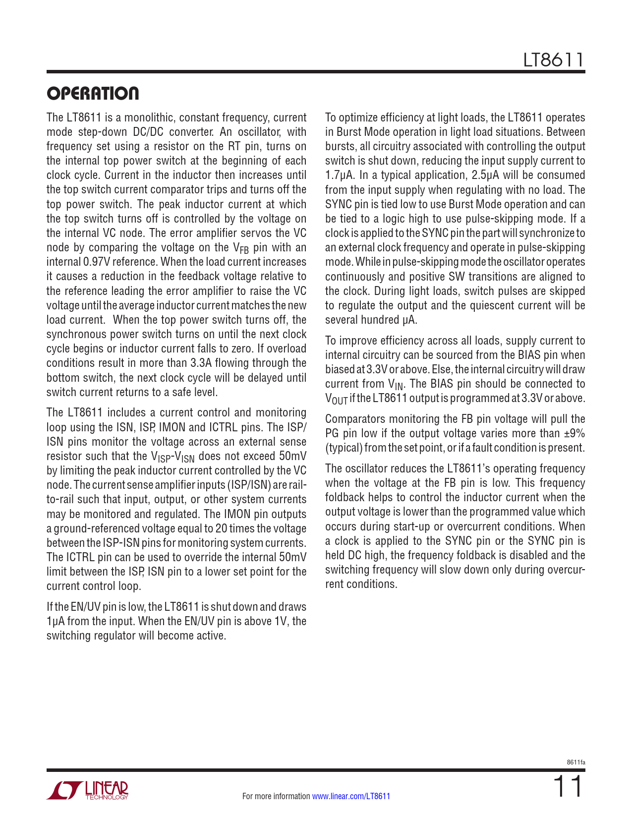 The LT8611 is a monolithic, constant frequency, current To optimize efficiency at light loads, the LT8611 operates mode step-down DC/DC converter. An oscillator, with in Burst Mode operation in light load situations. Between frequency set using a resistor on the RT pin, turns on bursts, all circuitry associated with controlling the output the internal top power switch at the beginning of each switch is shut down, reducing the input supply current to clock cycle. Current in the inductor then increases until 1.7μA. In a typical application, 2.5μA will be consumed the top switch current comparator trips and turns off the from the input supply when regulating with no load. The top power switch. The peak inductor current at which SYNC pin is tied low to use Burst Mode operation and can the top switch turns off is controlled by the voltage on be tied to a logic high to use pulse-skipping mode. If a the internal VC node. The error amplifier servos the VC clock is applied to the SYNC pin the part will synchronize to node by comparing the voltage on the VFB pin with an an external clock frequency and operate in pulse-skipping internal 0.97V reference. When the load current increases mode. While in pulse-skipping mode the oscillator operates it causes a reduction in the feedback voltage relative to continuously and positive SW transitions are aligned to the reference leading the error amplifier to raise the VC the clock. During light loads, switch pulses are skipped voltage until the average inductor current matches the new to regulate the output and the quiescent current will be load current. When the top power switch turns off, the several hundred µA. synchronous power switch turns on until the next clock To improve efficiency across all loads, supply current to cycle begins or inductor current falls to zero. If overload internal circuitry can be sourced from the BIAS pin when conditions result in more than 3.3A flowing through the biased at 3.3V or above. Else, the internal circuitry will draw bottom switch, the next clock cycle will be delayed until current from V switch current returns to a safe level. IN. The BIAS pin should be connected to VOUT if the LT8611 output is programmed at 3.3V or above. The LT8611 includes a current control and monitoring Comparators monitoring the FB pin voltage will pull the loop using the ISN, ISP, IMON and ICTRL pins. The ISP/ PG pin low if the output voltage varies more than ±9% ISN pins monitor the voltage across an external sense (typical) from the set point, or if a fault condition is present. resistor such that the VISP-VISN does not exceed 50mV by limiting the peak inductor current controlled by the VC The oscillator reduces the LT8611’s operating frequency node. The current sense amplifier inputs (ISP/ISN) are rail- when the voltage at the FB pin is low. This frequency to-rail such that input, output, or other system currents foldback helps to control the inductor current when the may be monitored and regulated. The IMON pin outputs output voltage is lower than the programmed value which a ground-referenced voltage equal to 20 times the voltage occurs during start-up or overcurrent conditions. When between the ISP-ISN pins for monitoring system currents. a clock is applied to the SYNC pin or the SYNC pin is The ICTRL pin can be used to override the internal 50mV held DC high, the frequency foldback is disabled and the limit between the ISP, ISN pin to a lower set point for the switching frequency will slow down only during overcur- current control loop. rent conditions. If the EN/UV pin is low, the LT8611 is shut down and draws 1µA from the input. When the EN/UV pin is above 1V, the switching regulator will become active. 8611fa For more information www.linear.com/LT8611 11 Document Outline Features Applications Description Typical Application Absolute Maximum Ratings Pin Configuration Order Information Electrical Characteristics Typical Performance Characteristics Pin Functions Block Diagram Operation Applications Information Typical Applications Package Description Typical Application Related Parts