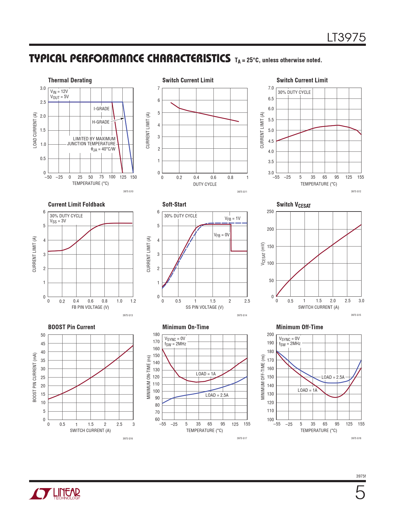 6 6 250 30% DUTY CYCLE 30% DUTY CYCLE V VFB = 1V SS = 3V 5 5 200 VFB = 0V 4 4 150 (mV) 3 3 V CESAT 100 CURRENT LIMIT (A) 2 CURRENT LIMIT (A) 2 50 1 1 0 0 0 0 0.2 0.4 0.6 0.8 1.0 1.2 0 0.5 1 1.5 2 2.5 0 0.5 1 1.5 2.0 2.5 3.0 FB PIN VOLTAGE (V) SS PIN VOLTAGE (V) SWITCH CURRENT (A) 3975 G13 3975 G14 3975 G15
