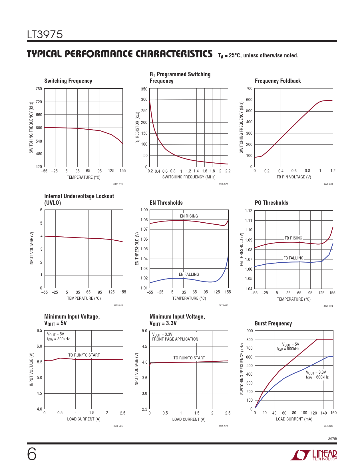 780 350 700 720 300 600 250 500 660 200 400 600 150 300 RESISTOR (kΩ) 540 R T 100 200 SWITCHING FREQUENCY (kHz) 480 SWITCHING FREQUENCY (kHz) 50 100 420 0 0 –55 –25 5 35 65 95 125 155 0.2 0.4 0.6 0.8 1 1.2 1.4 1.6 1.8 2 2.2 0 0.2 0.4 0.6 0.8 1 1.2 TEMPERATURE (°C) SWITCHING FREQUENCY (MHz) FB PIN VOLTAGE (V) 3975 G19 3975 G20 3975 G21