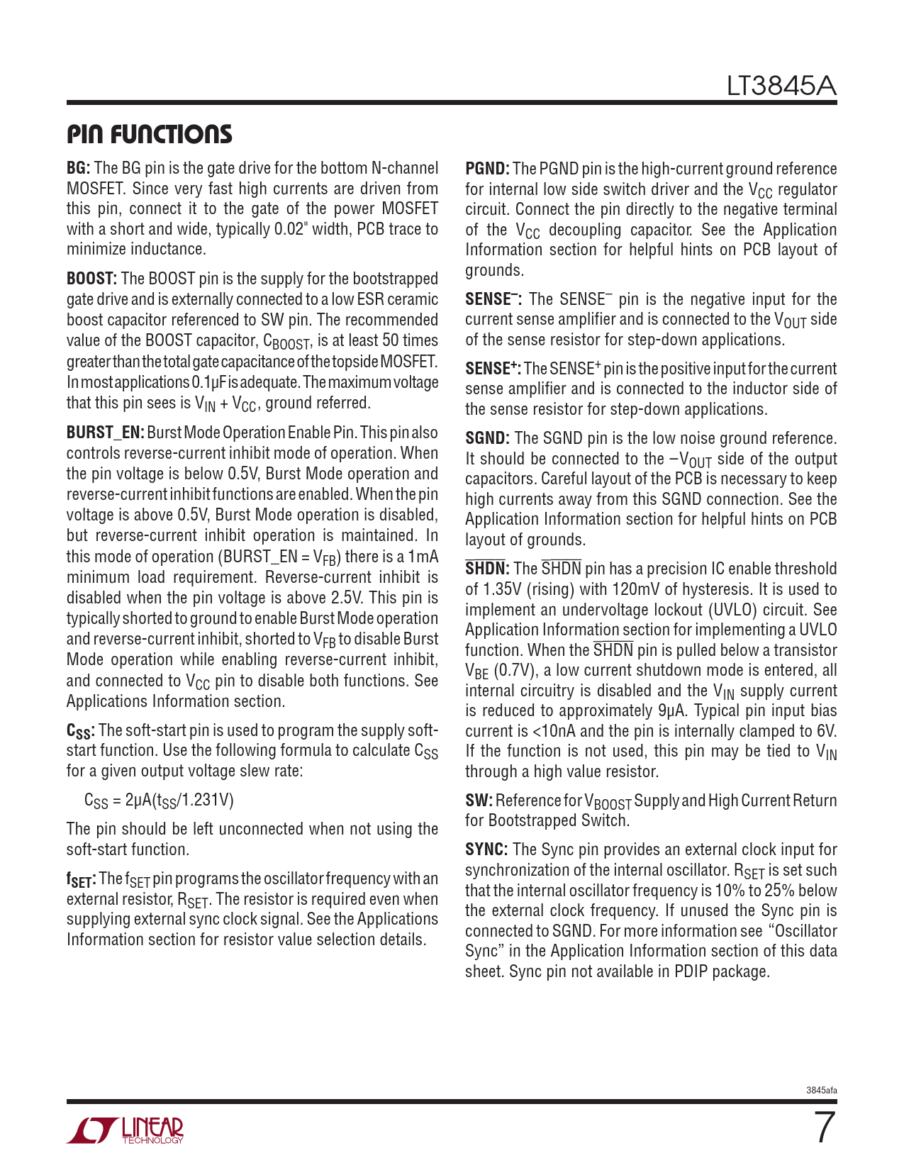 LT3845A PIN FUNCTIONS BG: The BG pin is the gate drive for the bottom N-channel PGND: The PGND pin is the high-current ground reference MOSFET. Since very fast high currents are driven from for internal low side switch driver and the VCC regulator this pin, connect it to the gate of the power MOSFET circuit. Connect the pin directly to the negative terminal with a short and wide, typically 0.02" width, PCB trace to of the VCC decoupling capacitor. See the Application minimize inductance. Information section for helpful hints on PCB layout of BOOST: The BOOST pin is the supply for the bootstrapped grounds. gate drive and is externally connected to a low ESR ceramic SENSE–: The SENSE– pin is the negative input for the boost capacitor referenced to SW pin. The recommended current sense amplifier and is connected to the VOUT side value of the BOOST capacitor, CBOOST, is at least 50 times of the sense resistor for step-down applications. greater than the total gate capacitance of the topside MOSFET. SENSE+: The SENSE+ pin is the positive input for the current In most applications 0.1µF is adequate. The maximum voltage sense amplifier and is connected to the inductor side of that this pin sees is VIN + VCC, ground referred. the sense resistor for step-down applications. BURST_EN: Burst Mode Operation Enable Pin. This pin also SGND: The SGND pin is the low noise ground reference. controls reverse-current inhibit mode of operation. When It should be connected to the –V the pin voltage is below 0.5V, Burst Mode operation and OUT side of the output capacitors. Careful layout of the PCB is necessary to keep reverse-current inhibit functions are enabled. When the pin high currents away from this SGND connection. See the voltage is above 0.5V, Burst Mode operation is disabled, Application Information section for helpful hints on PCB but reverse-current inhibit operation is maintained. In layout of grounds. this mode of operation (BURST_EN = VFB) there is a 1mA minimum load requirement. Reverse-current inhibit is SHDN: The SHDN pin has a precision IC enable threshold disabled when the pin voltage is above 2.5V. This pin is of 1.35V (rising) with 120mV of hysteresis. It is used to typically shorted to ground to enable Burst Mode operation implement an undervoltage lockout (UVLO) circuit. See and reverse-current inhibit, shorted to V Application Information section for implementing a UVLO FB to disable Burst Mode operation while enabling reverse-current inhibit, function. When the SHDN pin is pulled below a transistor and connected to V VBE (0.7V), a low current shutdown mode is entered, all CC pin to disable both functions. See Applications Information section. internal circuitry is disabled and the VIN supply current is reduced to approximately 9µA. Typical pin input bias CSS: The soft-start pin is used to program the supply soft- current is <10nA and the pin is internally clamped to 6V. start function. Use the following formula to calculate CSS If the function is not used, this pin may be tied to VIN for a given output voltage slew rate: through a high value resistor. CSS = 2µA(tSS/1.231V) SW: Reference for VBOOST Supply and High Current Return The pin should be left unconnected when not using the for Bootstrapped Switch. soft-start function. SYNC: The Sync pin provides an external clock input for f synchronization of the internal oscillator. R SET: The fSET pin programs the oscillator frequency with an SET is set such external resistor, R that the internal oscillator frequency is 10% to 25% below SET. The resistor is required even when supplying external sync clock signal. See the Applications the external clock frequency. If unused the Sync pin is Information section for resistor value selection details. connected to SGND. For more information see “Oscillator Sync” in the Application Information section of this data sheet. Sync pin not available in PDIP package. 3845afa 7 Document Outline Features Applications Description Typical Application Absolute Maximum Ratings Pin Configuration Order Information Electrical Characteristics Typical Performance Characteristics Pin Functions Block Diagram Applications Information Typical Applications Package Description Revision History Typical Application Related Parts