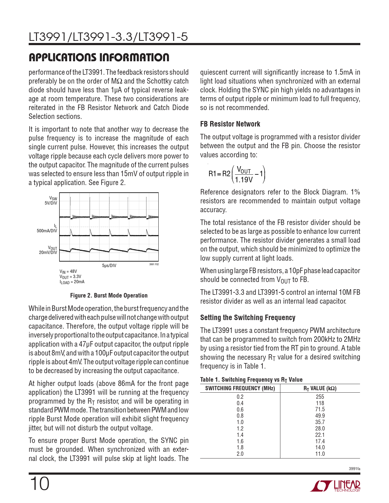 applicaTions inForMaTion. FB Resistor Network. Figure 2. Burst Mode Operation. Setting the Switching Frequency