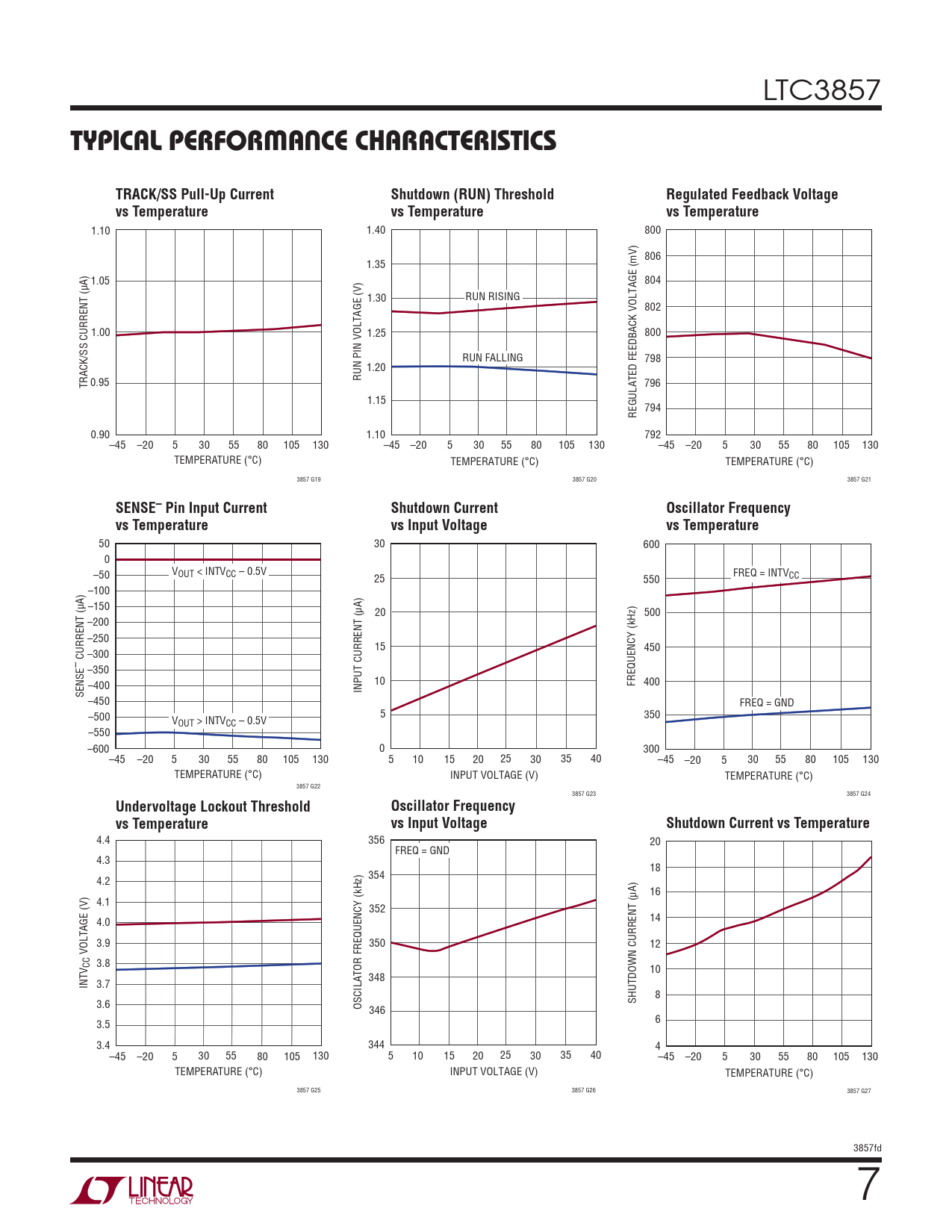 50 30 600 0 –50 VOUT < INTVCC – 0.5V FREQ = INTV 25 550 CC –100 –150 20 500 –200 –250 15 450 CURRENT (μA) –300 – –350 –400 10 FREQUENCY (kHz) 400 SENSE INPUT CURRENT (μA) –450 FREQ = GND –500 5 350 VOUT > INTVCC – 0.5V –550 –600 0 300 –45 –20 5 30 55 80 105 130 5 10 15 20 25 30 35 40 –45 –20 5 30 55 80 105 130 TEMPERATURE (°C) INPUT VOLTAGE (V) TEMPERATURE (°C) 3857 G22 3857 G23 3857 G24