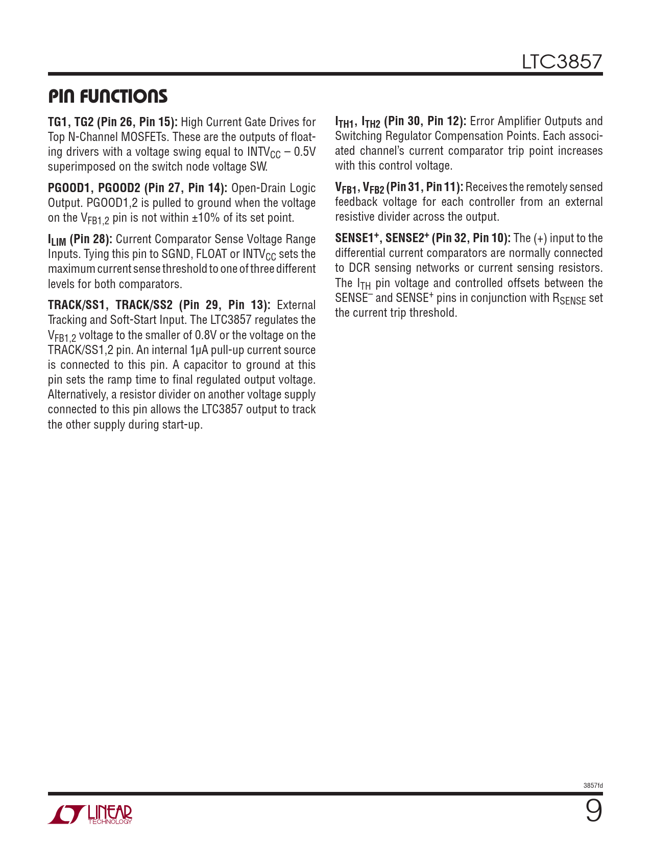 External SENSE set the current trip threshold. Tracking and Soft-Start Input. The LTC3857 regulates the VFB1,2 voltage to the smaller of 0.8V or the voltage on the TRACK/SS1,2 pin. An internal 1μA pull-up current source is connected to this pin. A capacitor to ground at this pin sets the ramp time to final regulated output voltage. Alternatively, a resistor divider on another voltage supply connected to this pin allows the LTC3857 output to track the other supply during start-up. 3857fd 9 Document Outline FEATURES DESCRIPTION APPLICATIONS TYPICAL APPLICATION ABSOLUTE MAXIMUM RATINGS PIN CONFIGURATION ORDER INFORMATION ELECTRICAL CHARACTERISTICS TYPICAL PERFORMANCE CHARACTERISTICS PIN FUNCTIONS FUNCTIONAL DIAGRAM OPERATION APPLICATIONS INFORMATION TYPICAL APPLICATIONS PACKAGE DESCRIPTION REVISION HISTORY TYPICAL APPLICATION RELATED PARTS