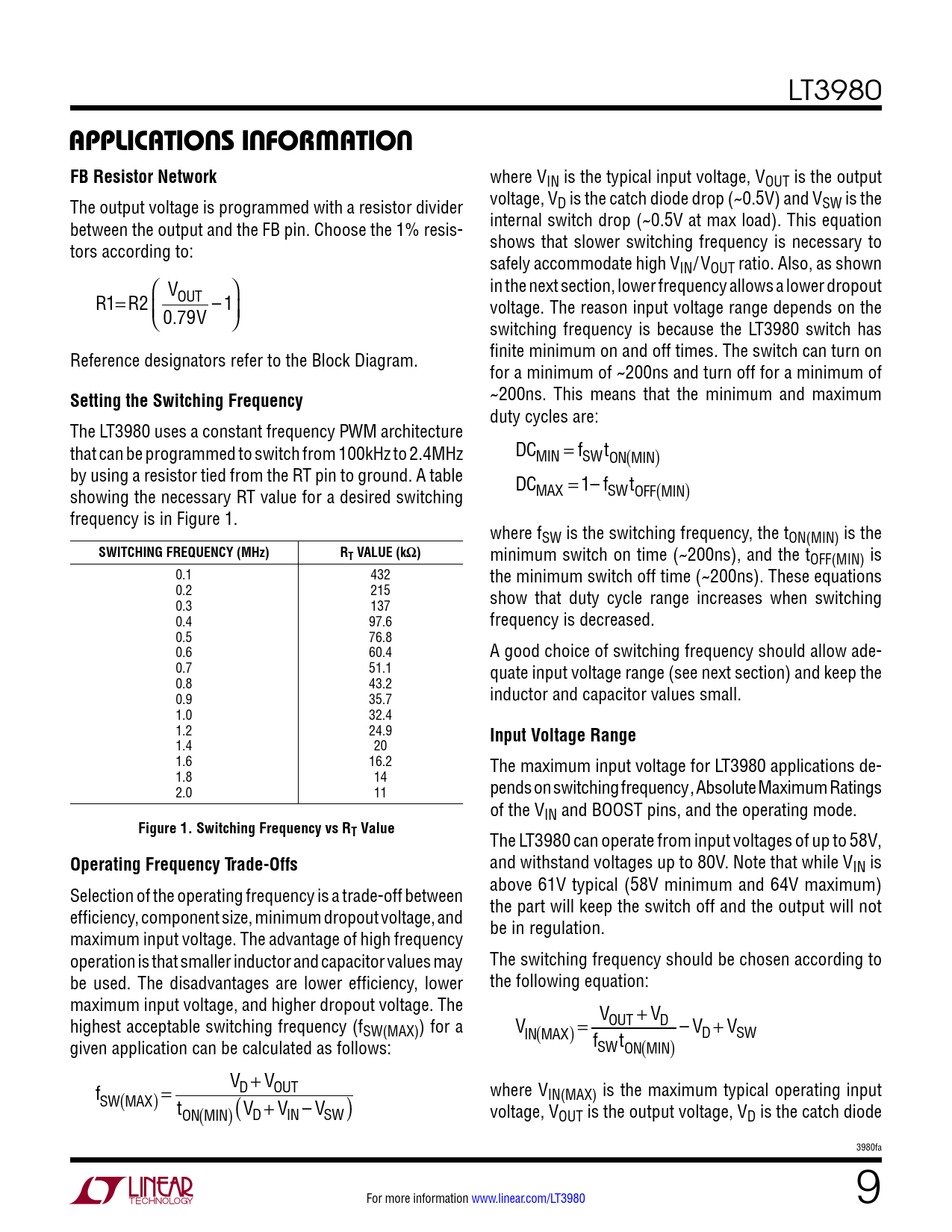 ~200ns. This means that the minimum and maximum duty cycles are: The LT3980 uses a constant frequency PWM architecture that can be programmed to switch from 100kHz to 2.4MHz DC = f t MIN SW ON MI ( N) by using a resistor tied from the RT pin to ground. A table DC = 1– f t showing the necessary RT value for a desired switching MAX SW OFF M ( IN) frequency is in Figure 1. where fSW is the switching frequency, the tON(MIN) is the