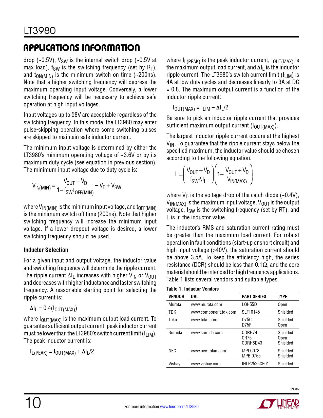 IL/2 Input voltages up to 58V are acceptable regardless of the Be sure to pick an inductor ripple current that provides switching frequency. In this mode, the LT3980 may enter sufficient maximum output current (I pulse-skipping operation where some switching pulses OUT(MAX)). are skipped to maintain safe inductor current. The largest inductor ripple current occurs at the highest V The minimum input voltage is determined by either the IN. To guarantee that the ripple current stays below the specified maximum, the inductor value should be chosen LT3980’s minimum operating voltage of ~3.6V or by its according to the following equation: maximum duty cycle (see equation in previous section). The minimum input voltage due to duty cycle is:  V + V   V + V  L OUT D OUT D =  1–  V + V  f ∆I   V  V OUT D = – V + V SW L  IN MA ( X)  IN MI ( N) 1– f t D SW SW OFF M ( IN) where VD is the voltage drop of the catch diode (~0.4V), V where V IN(MAX) is the maximum input voltage, VOUT is the output IN(MIN) is the minimum input voltage, and tOFF(MIN) voltage, f is the minimum switch off time (200ns). Note that higher SW is the switching frequency (set by RT), and L is in the inductor value. switching frequency will increase the minimum input voltage. If a lower dropout voltage is desired, a lower The inductor’s RMS and saturation current rating must switching frequency should be used. be greater than the maximum load current. For robust operation in fault conditions (start-up or short circuit) and