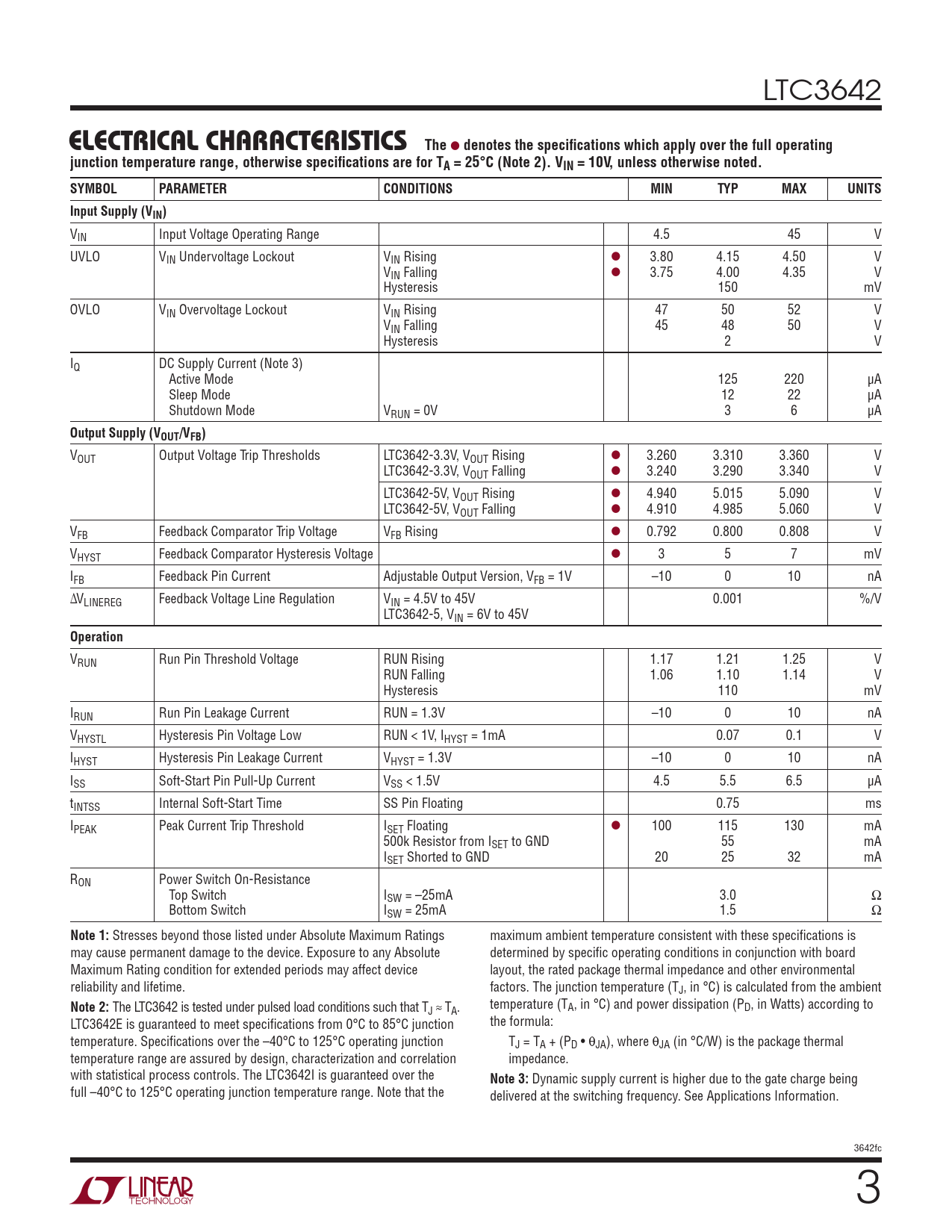 VOUT Output Voltage Trip Thresholds LTC3642-3.3V, VOUT Rising l 3.260 3.310 3.360 V LTC3642-3.3V, VOUT Falling l 3.240 3.290 3.340 V LTC3642-5V, VOUT Rising l 4.940 5.015 5.090 V LTC3642-5V, VOUT Falling l 4.910 4.985 5.060 V VFB Feedback Comparator Trip Voltage VFB Rising l 0.792 0.800 0.808 V VHYST Feedback Comparator Hysteresis Voltage l 3 5 7 mV IFB Feedback Pin Current Adjustable Output Version, VFB = 1V –10 0 10 nA ∆VLINEREG Feedback Voltage Line Regulation VIN = 4.5V to 45V 0.001 %/V LTC3642-5, VIN = 6V to 45V