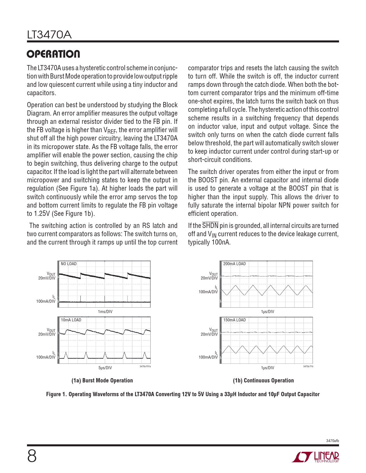 (1a) Burst Mode Operation (1b) Continuous Operation Figure 1. Operating Waveforms of the LT3470A Converting 12V to 5V Using a 33μH Inductor and 10μF Output Capacitor