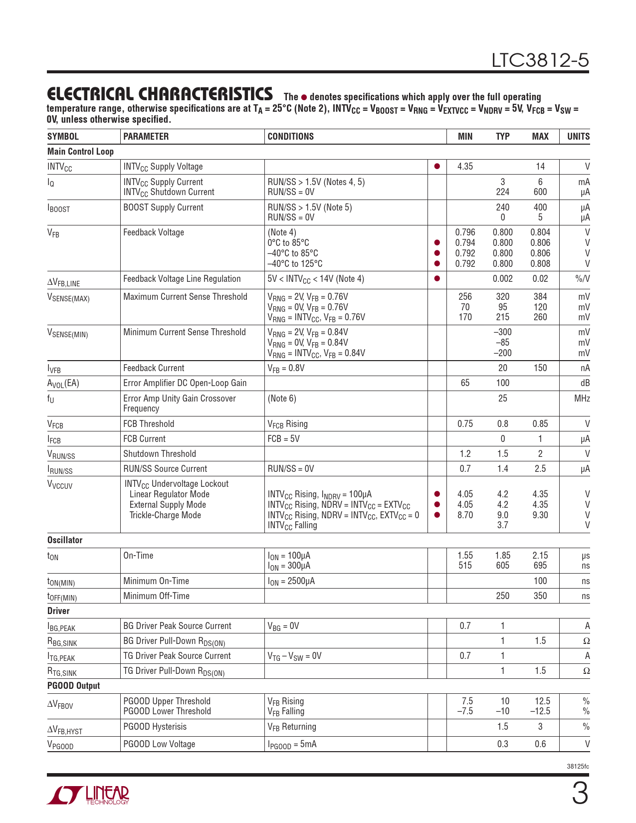 INTVCC INTVCC Supply Voltage l 4.35 14 V IQ INTVCC Supply Current RUN/SS > 1.5V (Notes 4, 5) 3 6 mA INTVCC Shutdown Current RUN/SS = 0V 224 600 μA IBOOST BOOST Supply Current RUN/SS > 1.5V (Note 5) 240 400 μA RUN/SS = 0V 0 5 μA VFB Feedback Voltage (Note 4) 0.796 0.800 0.804 V 0°C to 85°C l 0.794 0.800 0.806 V –40°C to 85°C l 0.792 0.800 0.806 V –40°C to 125°C l 0.792 0.800 0.808 V ∆V Feedback Voltage Line Regulation 5V < INTV FB,LINE CC < 14V (Note 4) l 0.002 0.02 %/V VSENSE(MAX) Maximum Current Sense Threshold VRNG = 2V, VFB = 0.76V 256 320 384 mV VRNG = 0V, VFB = 0.76V 70 95 120 mV VRNG = INTVCC, VFB = 0.76V 170 215 260 mV VSENSE(MIN) Minimum Current Sense Threshold VRNG = 2V, VFB = 0.84V –300 mV VRNG = 0V, VFB = 0.84V –85 mV VRNG = INTVCC, VFB = 0.84V –200 mV IVFB Feedback Current VFB = 0.8V 20 150 nA AVOL(EA) Error Amplifi er DC Open-Loop Gain 65 100 dB fU Error Amp Unity Gain Crossover (Note 6) 25 MHz Frequency VFCB FCB Threshold VFCB Rising 0.75 0.8 0.85 V IFCB FCB Current FCB = 5V 0 1 μA VRUN/SS Shutdown Threshold 1.2 1.5 2 V IRUN/SS RUN/SS Source Current RUN/SS = 0V 0.7 1.4 2.5 μA VVCCUV INTVCC Undervoltage Lockout Linear Regulator Mode INTVCC Rising, INDRV = 100μA l 4.05 4.2 4.35 V External Supply Mode INTVCC Rising, NDRV = INTVCC = EXTVCC l 4.05 4.2 4.35 V Trickle-Charge Mode INTVCC Rising, NDRV = INTVCC, EXTVCC = 0 l 8.70 9.0 9.30 V INTVCC Falling 3.7 V