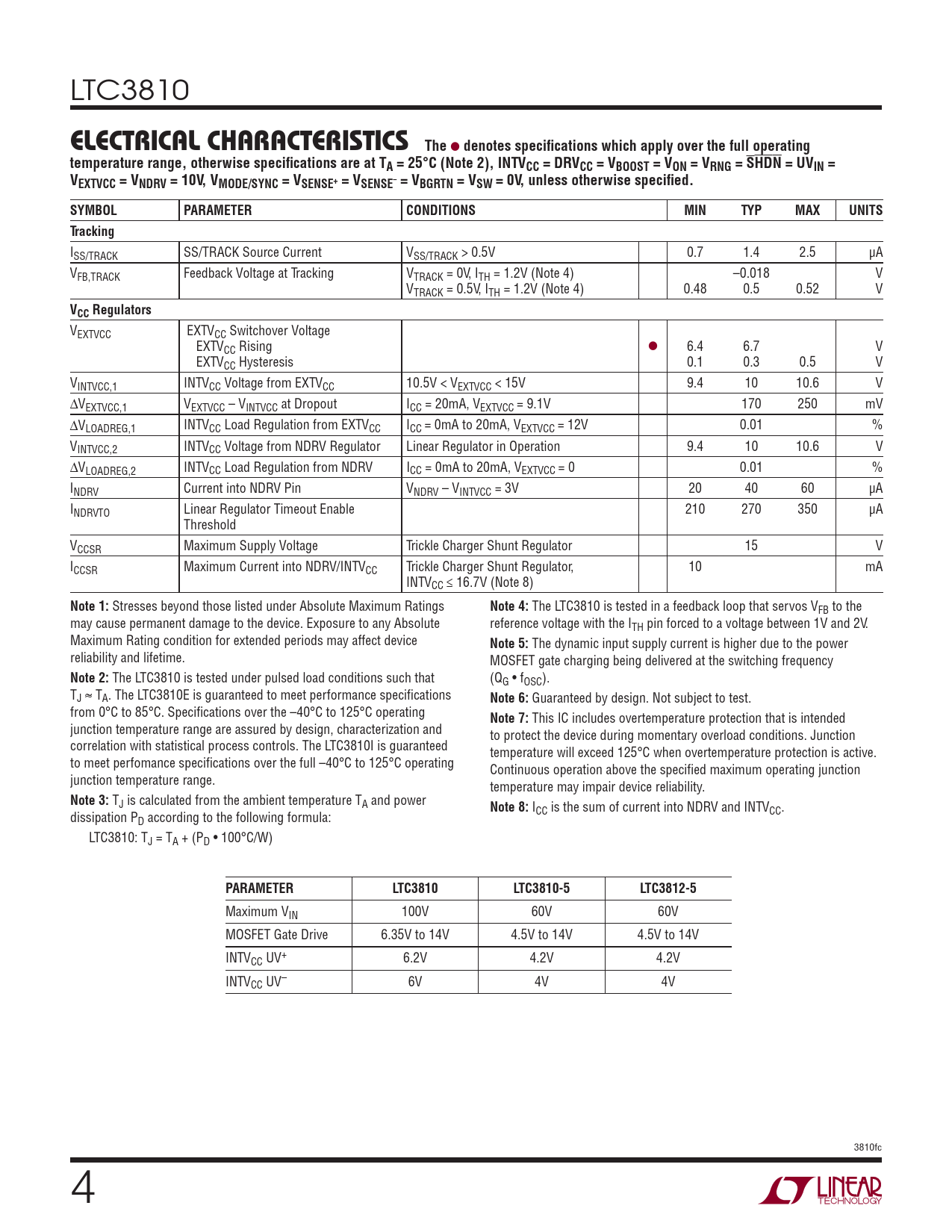 LTC3810 TheELECTRICAL CHARACTERISTICS l denotes specifi cations which apply over the full operatingtemperature range, otherwise specifi cations are at TA = 25°C (Note 2), INTVCC = DRVCC = VBOOST = VON = VRNG = SHDN = UVIN =VEXTVCC = VNDRV = 10V, VMODE/SYNC = VSENSE+ = VSENSE– = VBGRTN = VSW = 0V, unless otherwise specifi ed.SYMBOLPARAMETERCONDITIONSMINTYPMAXUNITSTracking ISS/TRACK SS/TRACK Source Current VSS/TRACK > 0.5V 0.7 1.4 2.5 μA VFB,TRACK Feedback Voltage at Tracking VTRACK = 0V, ITH = 1.2V (Note 4) –0.018 V VTRACK = 0.5V, ITH = 1.2V (Note 4) 0.48 0.5 0.52 V VCC Regulators VEXTVCC EXTVCC Switchover Voltage EXTVCC Rising l 6.4 6.7 V EXTVCC Hysteresis 0.1 0.3 0.5 V VINTVCC,1 INTVCC Voltage from EXTVCC 10.5V < VEXTVCC < 15V 9.4 10 10.6 V ∆VEXTVCC,1 VEXTVCC – VINTVCC at Dropout ICC = 20mA, VEXTVCC = 9.1V 170 250 mV ∆VLOADREG,1 INTVCC Load Regulation from EXTVCC ICC = 0mA to 20mA, VEXTVCC = 12V 0.01 % VINTVCC,2 INTVCC Voltage from NDRV Regulator Linear Regulator in Operation 9.4 10 10.6 V ∆VLOADREG,2 INTVCC Load Regulation from NDRV ICC = 0mA to 20mA, VEXTVCC = 0 0.01 % INDRV Current into NDRV Pin VNDRV – VINTVCC = 3V 20 40 60 μA INDRVTO Linear Regulator Timeout Enable 210 270 350 μA Threshold VCCSR Maximum Supply Voltage Trickle Charger Shunt Regulator 15 V ICCSR Maximum Current into NDRV/INTVCC Trickle Charger Shunt Regulator, 10 mA INTVCC ≤ 16.7V (Note 8) Note 1: Stresses beyond those listed under Absolute Maximum Ratings Note 4: The LTC3810 is tested in a feedback loop that servos VFB to the may cause permanent damage to the device. Exposure to any Absolute reference voltage with the ITH pin forced to a voltage between 1V and 2V. Maximum Rating condition for extended periods may affect device Note 5: The dynamic input supply current is higher due to the power reliability and lifetime. MOSFET gate charging being delivered at the switching frequency Note 2: The LTC3810 is tested under pulsed load conditions such that (QG • fOSC). TJ ≈ TA. The LTC3810E is guaranteed to meet performance specifi cations Note 6: Guaranteed by design. Not subject to test. from 0°C to 85°C. Specifi cations over the –40°C to 125°C operating Note 7: This IC includes overtemperature protection that is intended junction temperature range are assured by design, characterization and to protect the device during momentary overload conditions. Junction correlation with statistical process controls. The LTC3810I is guaranteed temperature will exceed 125°C when overtemperature protection is active. to meet perfomance specifi cations over the full –40°C to 125°C operating Continuous operation above the specifi ed maximum operating junction junction temperature range. temperature may impair device reliability. Note 3: TJ is calculated from the ambient temperature TA and power Note 8: ICC is the sum of current into NDRV and INTVCC. dissipation PD according to the following formula: LTC3810: TJ = TA + (PD • 100°C/W) PARAMETERLTC3810LTC3810-5LTC3812-5 Maximum VIN 100V 60V 60V MOSFET Gate Drive 6.35V to 14V 4.5V to 14V 4.5V to 14V INTVCC UV+ 6.2V 4.2V 4.2V INTVCC UV– 6V 4V 4V 3810fc 4