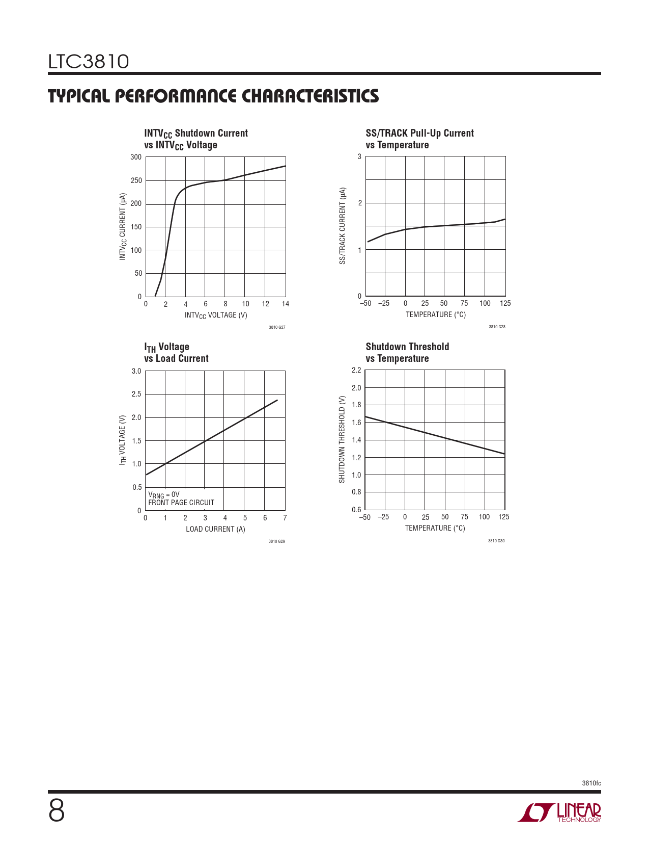 3.0 2.2 2.0 2.5 1.8 2.0 1.6 1.5 1.4 VOLTAGE (V) 1.2 I TH 1.0 1.0 SHUTDOWN THRESHOLD (V) 0.5 V 0.8 RNG = 0V FRONT PAGE CIRCUIT 0 0.6 0 1 2 3 4 5 6 7 –50 –25 0 25 50 75 100 125 LOAD CURRENT (A) TEMPERATURE (°C) 3810 G29 3810 G30 3810fc 8