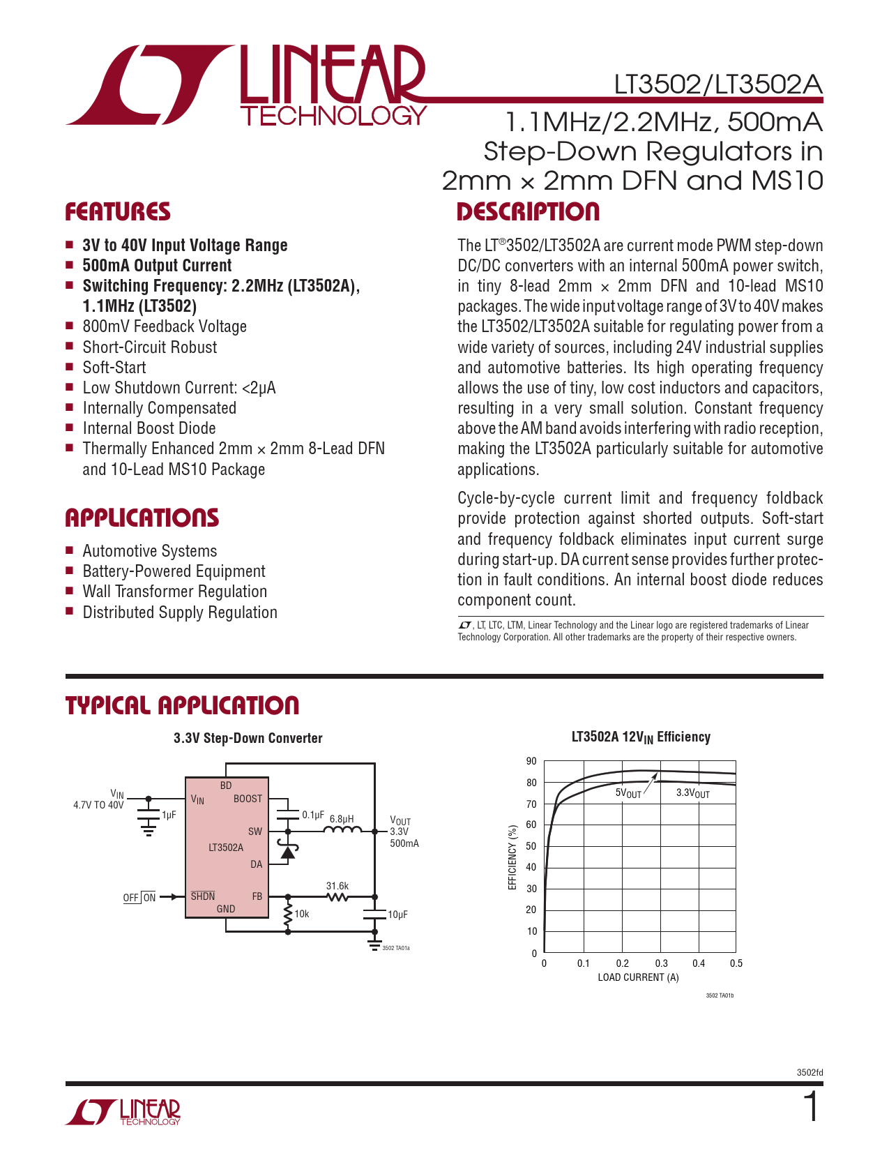 LT3502/LT3502A 1.1MHz/2.2MHz, 500mA Step-Down Regulators in 2mm × 2mm DFN and MS10 FeaturesDescription n 3V to 40V Input Voltage Range The LT®3502/LT3502A are current mode PWM step-down n 500mA Output Current DC/DC converters with an internal 500mA power switch, n Switching Frequency: 2.2MHz (LT3502A), in tiny 8-lead 2mm × 2mm DFN and 10-lead MS10 1.1MHz (LT3502) packages. The wide input voltage range of 3V to 40V makes n 800mV Feedback Voltage the LT3502/LT3502A suitable for regulating power from a n Short-Circuit Robust wide variety of sources, including 24V industrial supplies n Soft-Start and automotive batteries. Its high operating frequency n Low Shutdown Current: <2µA allows the use of tiny, low cost inductors and capacitors, n Internally Compensated resulting in a very small solution. Constant frequency n Internal Boost Diode above the AM band avoids interfering with radio reception, n Thermally Enhanced 2mm × 2mm 8-Lead DFN making the LT3502A particularly suitable for automotive and 10-Lead MS10 Package applications. Cycle-by-cycle current limit and frequency foldback applications provide protection against shorted outputs. Soft-start and frequency foldback eliminates input current surge n Automotive Systems during start-up. DA current sense provides further protec- n Battery-Powered Equipment tion in fault conditions. An internal boost diode reduces n Wall Transformer Regulation component count. n Distributed Supply Regulation L, LT, LTC, LTM, Linear Technology and the Linear logo are registered trademarks of Linear Technology Corporation. All other trademarks are the property of their respective owners. typical application3.3V Step-Down ConverterLT3502A 12VIN Efficiency 90 BD 80 VIN V 5VOUT 3.3VOUT IN BOOST 4.7V TO 40V 70 1µF 0.1µF 6.8µH VOUT 60 SW 3.3V LT3502A 500mA 50 DA 40 31.6k EFFICIENCY (%) 30 OFF ON SHDN FB GND 10k 10µF 20 10 3502 TA01a 0 0 0.1 0.2 0.3 0.4 0.5 LOAD CURRENT (A) 3502 TA01b 3502fd 1 Document Outline Features Applications Description Typical Application Absolute Maximum Ratings Pin Configuration Order Information Electrical Characteristics Typical Performance Characteristics Pin Functions Block Diagram Operation Applications Information Typical Applications Package Description Typical Application Related Parts
