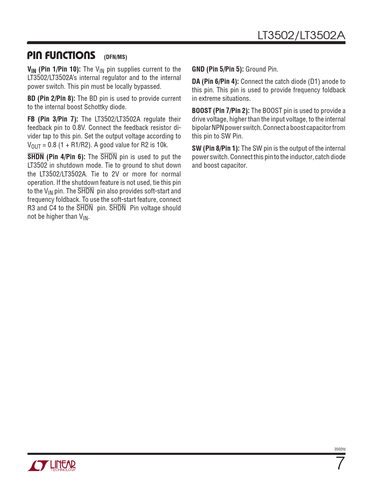 pin Functions (DFN/MS). VIN (Pin 1/Pin 10):. GND (Pin 5/Pin 5):. DA (Pin 6/Pin 4):. BD (Pin 2/Pin 8):. BOOST (Pin 7/Pin 2):