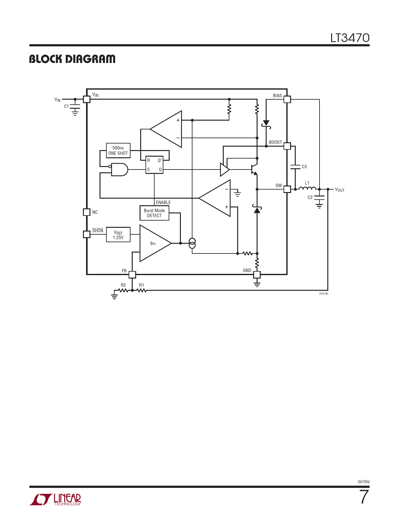 VIN BIAS VIN C1 + – BOOST 500ns ONE SHOT R Q′ C3 S Q – SW L1 VOUT C2 ENABLE + Burst Mode NC DETECT SHDN VREF 1.25V gm FB GND R2 R1 3470 BD 3470fd 7 Document Outline Features Applications Description Typical Application Absolute Maximum Ratings Pin Configuration Order Information Electrical Characteristics Typical Performance Characteristics Pin Functions Block Diagram Operation Applications Information Typical Applications Package Description Revision History Related Parts