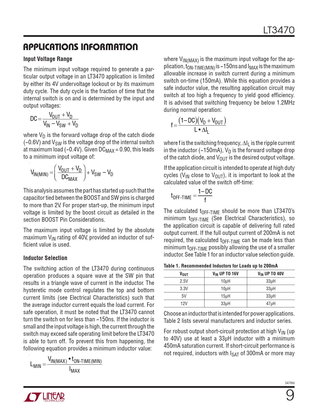 applicaTions inForMaTion. Input Voltage Range. Inductor Selection. Table 1. Recommended Inductors for Loads up to 200mA. VOUT