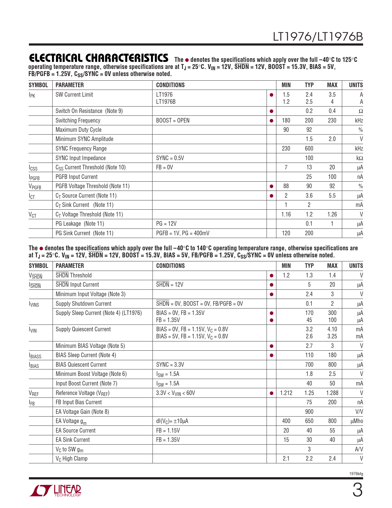 VSHDN SHDN Threshold ● 1.2 1.3 1.4 V ISHDN SHDN Input Current SHDN = 12V ● 5 20 μA Minimum Input Voltage (Note 3) ● 2.4 3 V IVINS Supply Shutdown Current SHDN = 0V, BOOST = 0V, FB/PGFB = 0V 0.1 2 μA Supply Sleep Current (Note 4) (LT1976) BIAS = 0V, FB = 1.35V ● 170 300 μA FB = 1.35V ● 45 100 μA IVIN Supply Quiescent Current BIAS = 0V, FB = 1.15V, VC = 0.8V 3.2 4.10 mA BIAS = 5V, FB = 1.15V, VC = 0.8V 2.6 3.25 mA Minimum BIAS Voltage (Note 5) ● 2.7 3 V IBIASS BIAS Sleep Current (Note 4) ● 110 180 μA IBIAS BIAS Quiescent Current SYNC = 3.3V 700 800 μA Minimum Boost Voltage (Note 6) ISW = 1.5A 1.8 2.5 V Input Boost Current (Note 7) ISW = 1.5A 40 50 mA VREF Reference Voltage (VREF) 3.3V < VVIN < 60V ● 1.212 1.25 1.288 V IFB FB Input Bias Current 75 200 nA EA Voltage Gain (Note 8) 900 V/V EA Voltage gm dI(VC)= ±10μA 400 650 800 μMho EA Source Current FB = 1.15V 20 40 55 μA EA Sink Current FB = 1.35V 15 30 40 μA VC to SW gm 3 A/V VC High Clamp 2.1 2.2 2.4 V 1976bfg 3