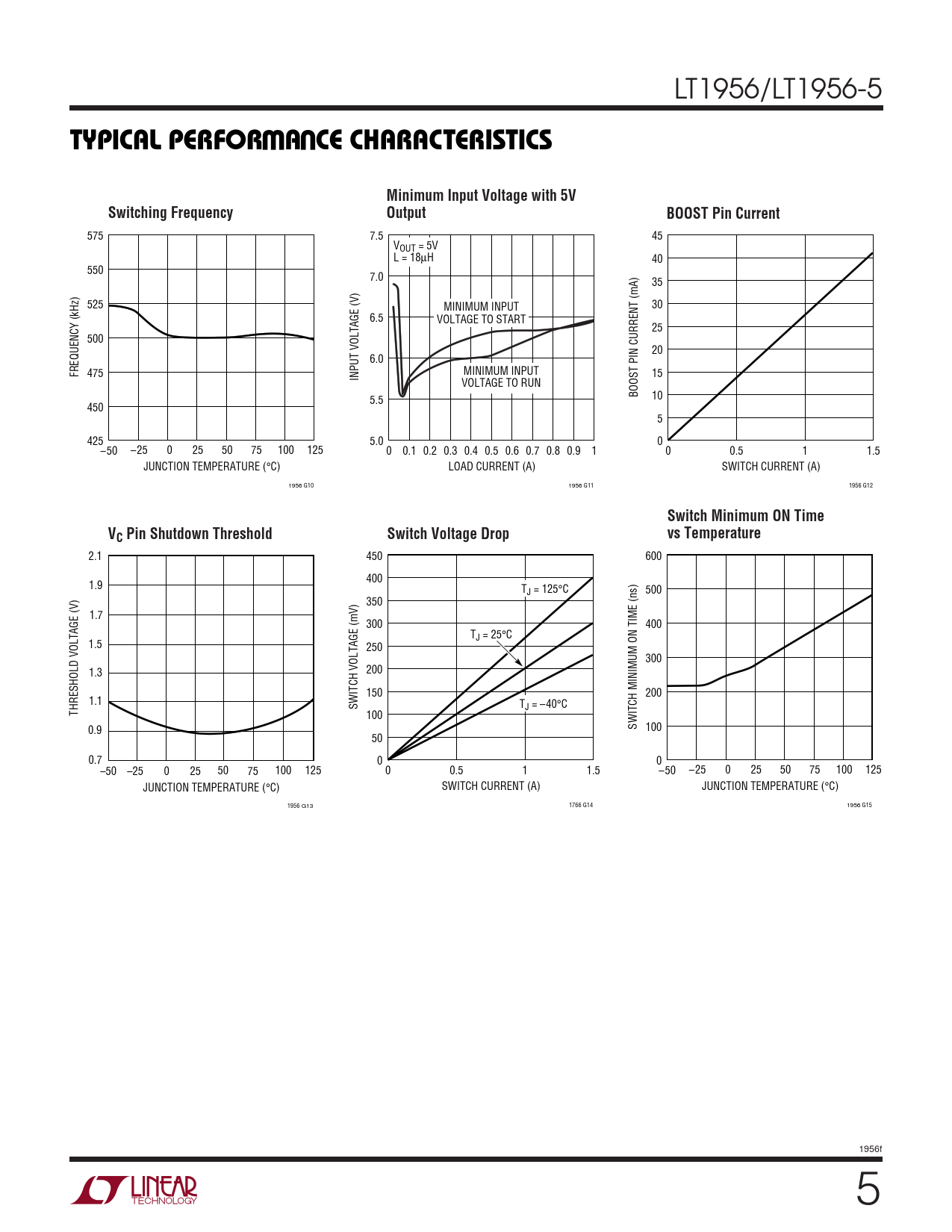 2.1 450 600 400 1.9 TJ = 125°C 500 350 1.7 300 400 TJ = 25°C 1.5 250 300 1.3 200 150 200 1.1 SWITCH VOLTAGE (mV) TJ = –40°C THRESHOLD VOLTAGE (V) 100 0.9 SWITCH MINIMUM ON TIME (ns) 100 50 0.7 0 0 –50 –25 0 25 50 75 100 125 0 0.5 1 1.5 –50 –25 0 25 50 75 100 125 JUNCTION TEMPERATURE (°C) SWITCH CURRENT (A) JUNCTION TEMPERATURE (°C) 1956 G13 1766 G14 1956 G15 1956f 5