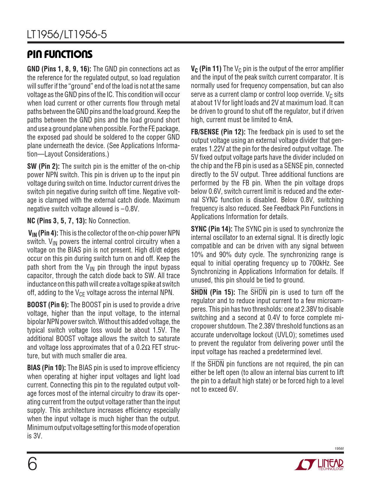 The BIAS pin is used to improve efficiency either be left open (to allow an internal bias current to lift when operating at higher input voltages and light load the pin to a default high state) or be forced high to a level current. Connecting this pin to the regulated output volt- not to exceed 6V. age forces most of the internal circuitry to draw its oper- ating current from the output voltage rather than the input supply. This architecture increases efficiency especially when the input voltage is much higher than the output. Minimum output voltage setting for this mode of operation is 3V. 1956f 6