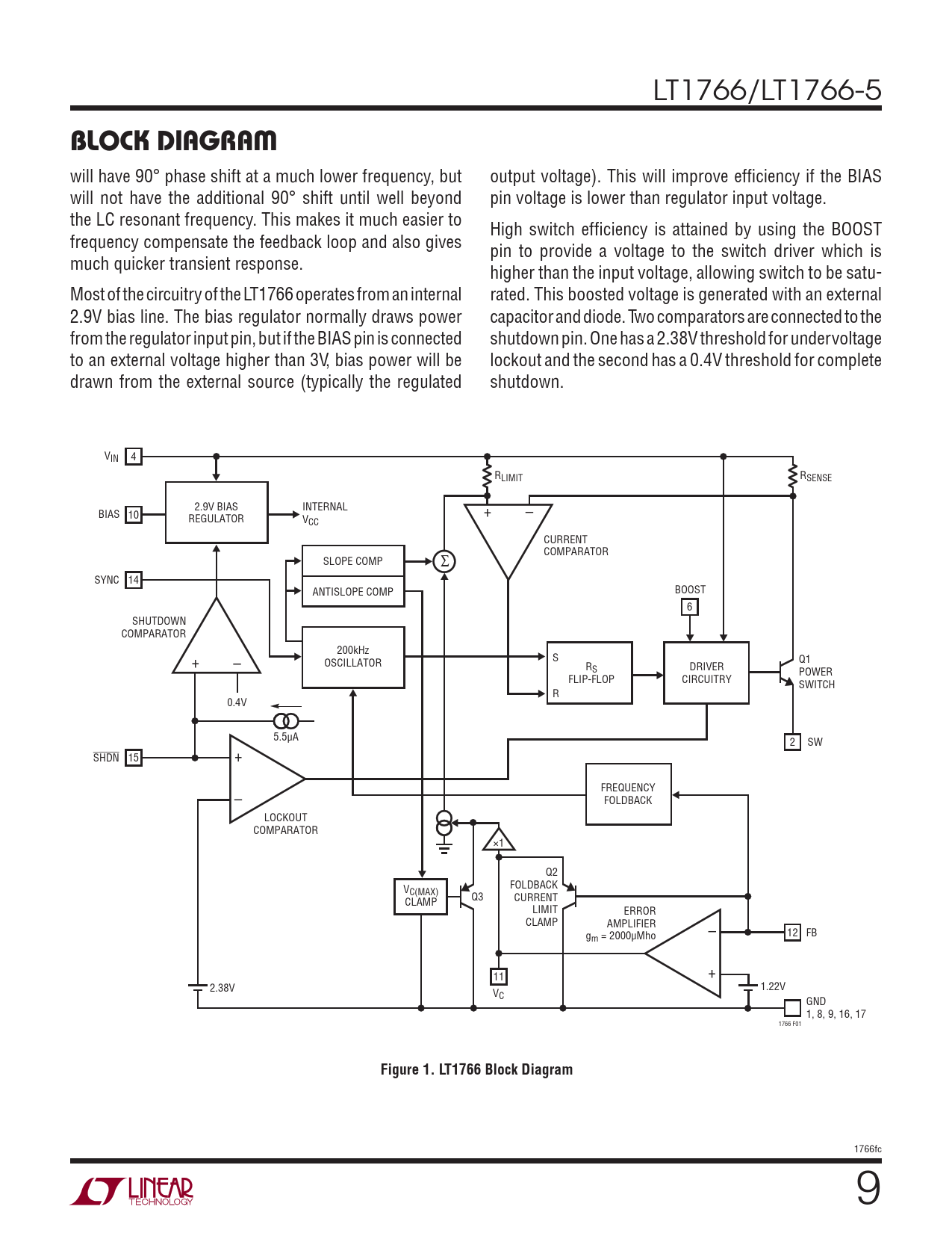 LT1766/LT1766-5 BLOCK DIAGRAM will have 90° phase shift at a much lower frequency, but output voltage). This will improve effi ciency if the BIAS will not have the additional 90° shift until well beyond pin voltage is lower than regulator input voltage. the LC resonant frequency. This makes it much easier to High switch effi ciency is attained by using the BOOST frequency compensate the feedback loop and also gives pin to provide a voltage to the switch driver which is much quicker transient response. higher than the input voltage, allowing switch to be satu- Most of the circuitry of the LT1766 operates from an internal rated. This boosted voltage is generated with an external 2.9V bias line. The bias regulator normally draws power capacitor and diode. Two comparators are connected to the from the regulator input pin, but if the BIAS pin is connected shutdown pin. One has a 2.38V threshold for undervoltage to an external voltage higher than 3V, bias power will be lockout and the second has a 0.4V threshold for complete drawn from the external source (typically the regulated shutdown. VIN 4 RLIMIT RSENSE 2.9V BIAS INTERNAL + – BIAS 10 REGULATOR VCC CURRENT COMPARATOR SLOPE COMP ∑ SYNC 14 ANTISLOPE COMP BOOST 6 SHUTDOWN COMPARATOR + – 200kHz S OSCILLATOR Q1 RS DRIVER POWER FLIP-FLOP CIRCUITRY SWITCH R 0.4V 5.5μA 2 SW SHDN 15 + FREQUENCY – FOLDBACK LOCKOUT COMPARATOR ×1 Q2 FOLDBACK VC(MAX) Q3 CURRENT CLAMP LIMIT ERROR CLAMP AMPLIFIER – 12 FB gm = 2000μMho + 11 2.38V 1.22V VC GND 1, 8, 9, 16, 17 1766 F01 Figure 1. LT1766 Block Diagram 1766fc 9