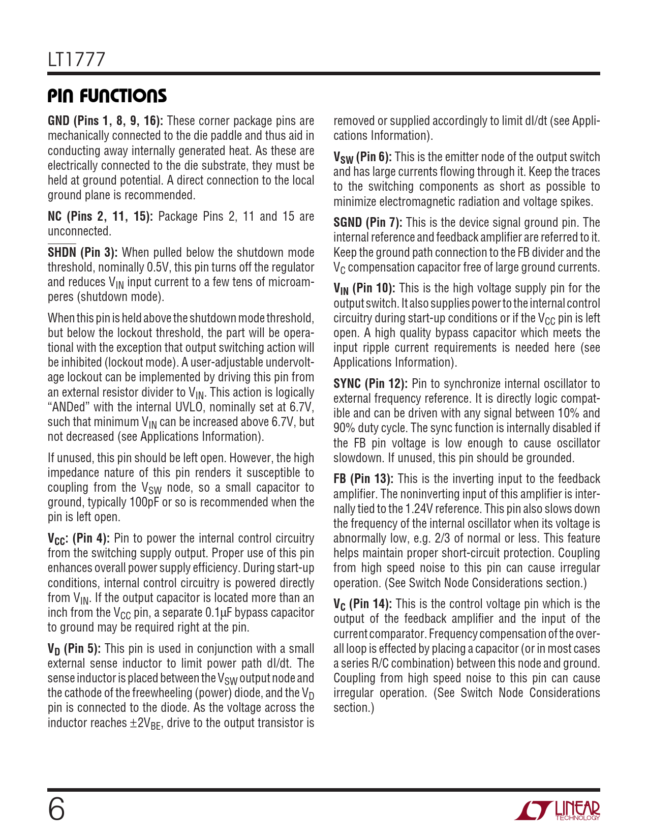 PIN FUNCTIONS. GND (Pins 1, 8, 9, 16):. VSW (Pin 6):. NC (Pins 2, 11, 15):. SGND (Pin 7):. SHDN (Pin 3):. VIN (Pin 10):