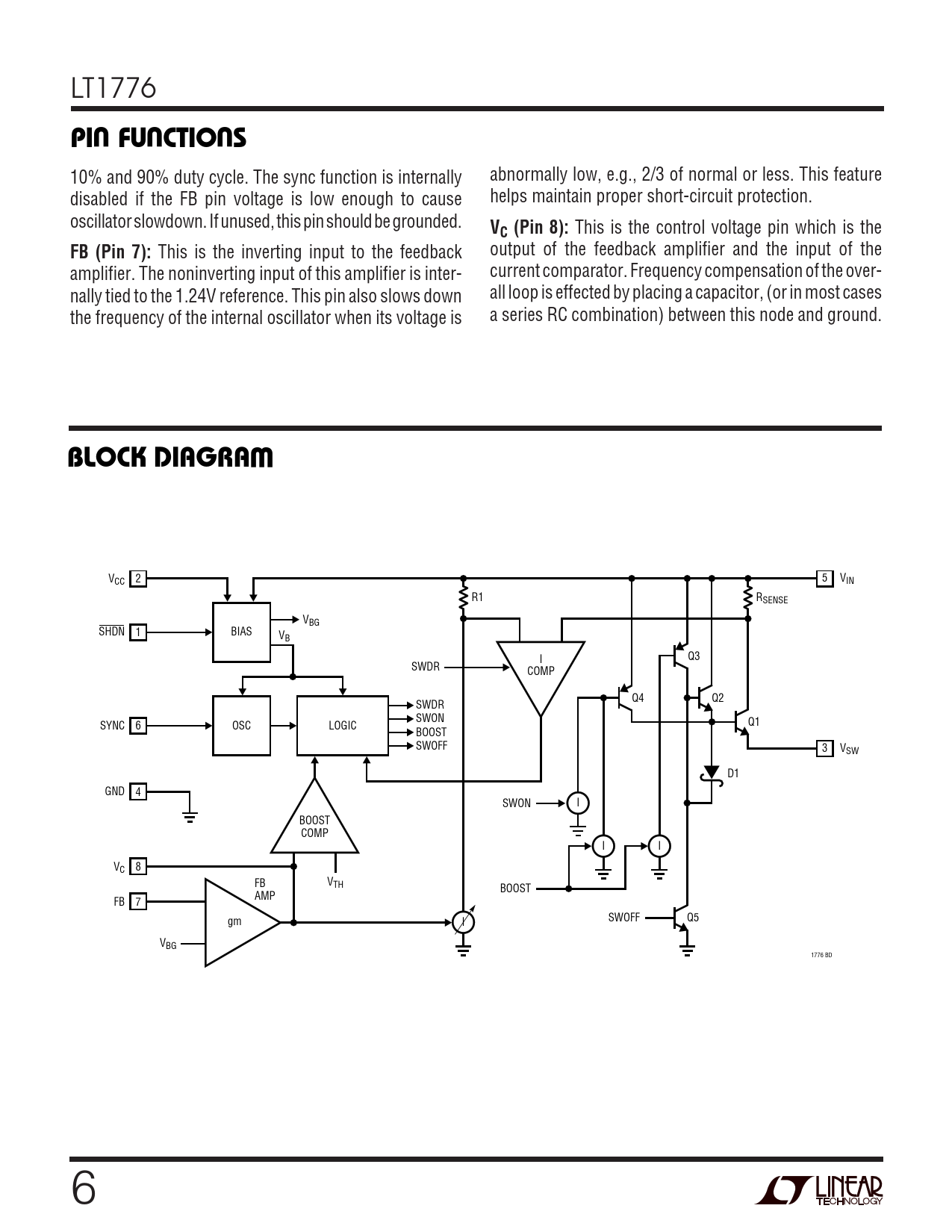 VCC 2 5 VIN R1 RSENSE VBG SHDN 1 BIAS VB I Q3 SWDR COMP Q4 Q2 SWDR SWON SYNC 6 OSC LOGIC Q1 BOOST SWOFF 3 VSW D1 GND 4 SWON I BOOST COMP I I VC 8 FB VTH BOOST AMP FB 7 SWOFF gm I Q5 VBG 1776 BD 6