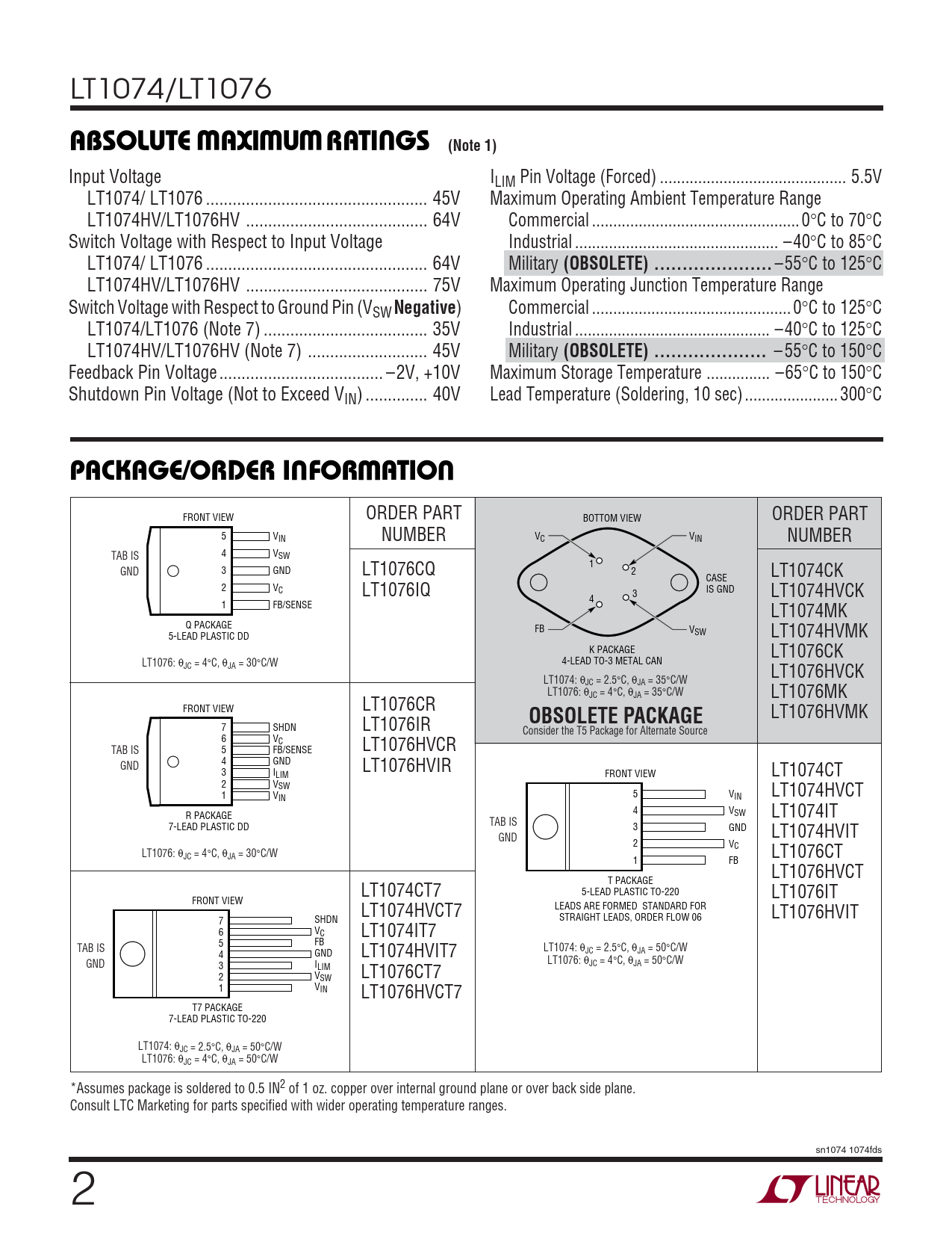 ) Commercial ... 0°C to 125°C LT1074/LT1076 (Note 7) ... 35V Industrial .. –40°C to 125°C LT1074HV/LT1076HV (Note 7) ... 45V Military