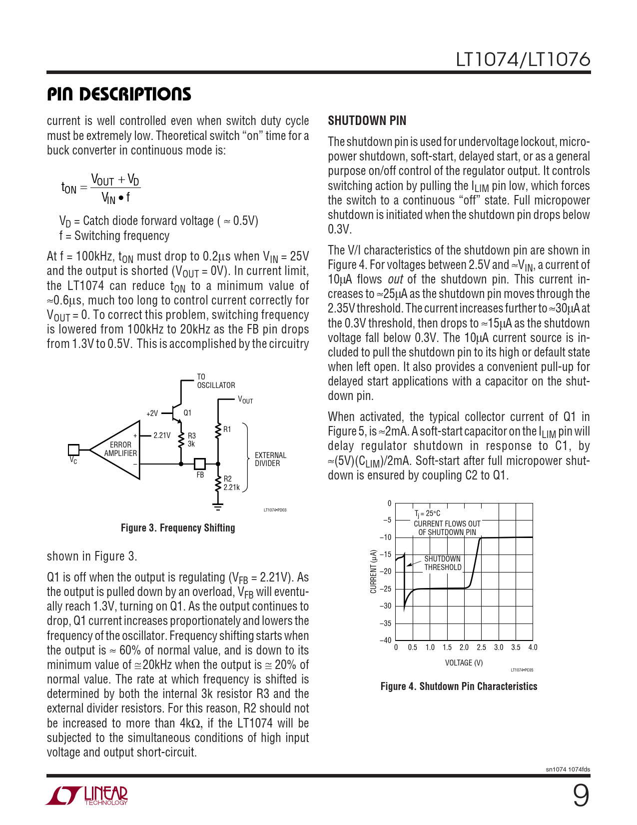 LT1074/LT1076 UUPI DESCRIPTIO S current is well controlled even when switch duty cycle SHUTDOWN PIN must be extremely low. Theoretical switch “on” time for a The shutdown pin is used for undervoltage lockout, micro- buck converter in continuous mode is: power shutdown, soft-start, delayed start, or as a general purpose on/off control of the regulator output. It controls V V t OUT D ON = + switching action by pulling the ILIM pin low, which forces V • f IN the switch to a continuous “off” state. Full micropower shutdown is initiated when the shutdown pin drops below VD = Catch diode forward voltage ( ≈ 0.5V) 0.3V. f = Switching frequency The V/I characteristics of the shutdown pin are shown in At f = 100kHz, tON must drop to 0.2µs when VIN = 25V Figure 4. For voltages between 2.5V and ≈V and the output is shorted (V IN, a current of OUT = 0V). In current limit, 10µA flows out of the shutdown pin. This current in- the LT1074 can reduce tON to a minimum value of ≈ creases to ≈25µA as the shutdown pin moves through the 0.6µs, much too long to control current correctly for 2.35V threshold. The current increases further to ≈30µA at VOUT = 0. To correct this problem, switching frequency the 0.3V threshold, then drops to ≈15µA as the shutdown is lowered from 100kHz to 20kHz as the FB pin drops voltage fall below 0.3V. The 10µA current source is in- from 1.3V to 0.5V. This is accomplished by the circuitry cluded to pull the shutdown pin to its high or default state when left open. It also provides a convenient pull-up for TO OSCILLATOR delayed start applications with a capacitor on the shut- V down pin. OUT +2V Q1 When activated, the typical collector current of Q1 in R1 + Figure 5, is 2.21V R3 ≈2mA. A soft-start capacitor on the ILIM pin will ERROR 3k delay regulator shutdown in response to C1, by AMPLIFIER EXTERNAL VC – DIVIDER ≈(5V)(CLIM)/2mA. Soft-start after full micropower shut- FB R2 down is ensured by coupling C2 to Q1. 2.21k 0 LT1074•PD03 T = 25 j °C –5 Figure 3. Frequency Shifting CURRENT FLOWS OUT OF SHUTDOWN PIN –10 shown in Figure 3. µA) –15 SHUTDOWN THRESHOLD Q1 is off when the output is regulating (V –20 FB = 2.21V). As the output is pulled down by an overload, V –25 FB will eventu- CURRENT ( ally reach 1.3V, turning on Q1. As the output continues to –30 drop, Q1 current increases proportionately and lowers the –35 frequency of the oscillator. Frequency shifting starts when –40 the output is ≈ 60% of normal value, and is down to its 0 0.5 1.0 1.5 2.0 2.5 3.0 3.5 4.0 minimum value of ≅ 20kHz when the output is ≅ 20% of VOLTAGE (V) LT1074•PC05 normal value. The rate at which frequency is shifted is Figure 4. Shutdown Pin Characteristics determined by both the internal 3k resistor R3 and the external divider resistors. For this reason, R2 should not be increased to more than 4kΩ, if the LT1074 will be subjected to the simultaneous conditions of high input voltage and output short-circuit. sn1074 1074fds 9