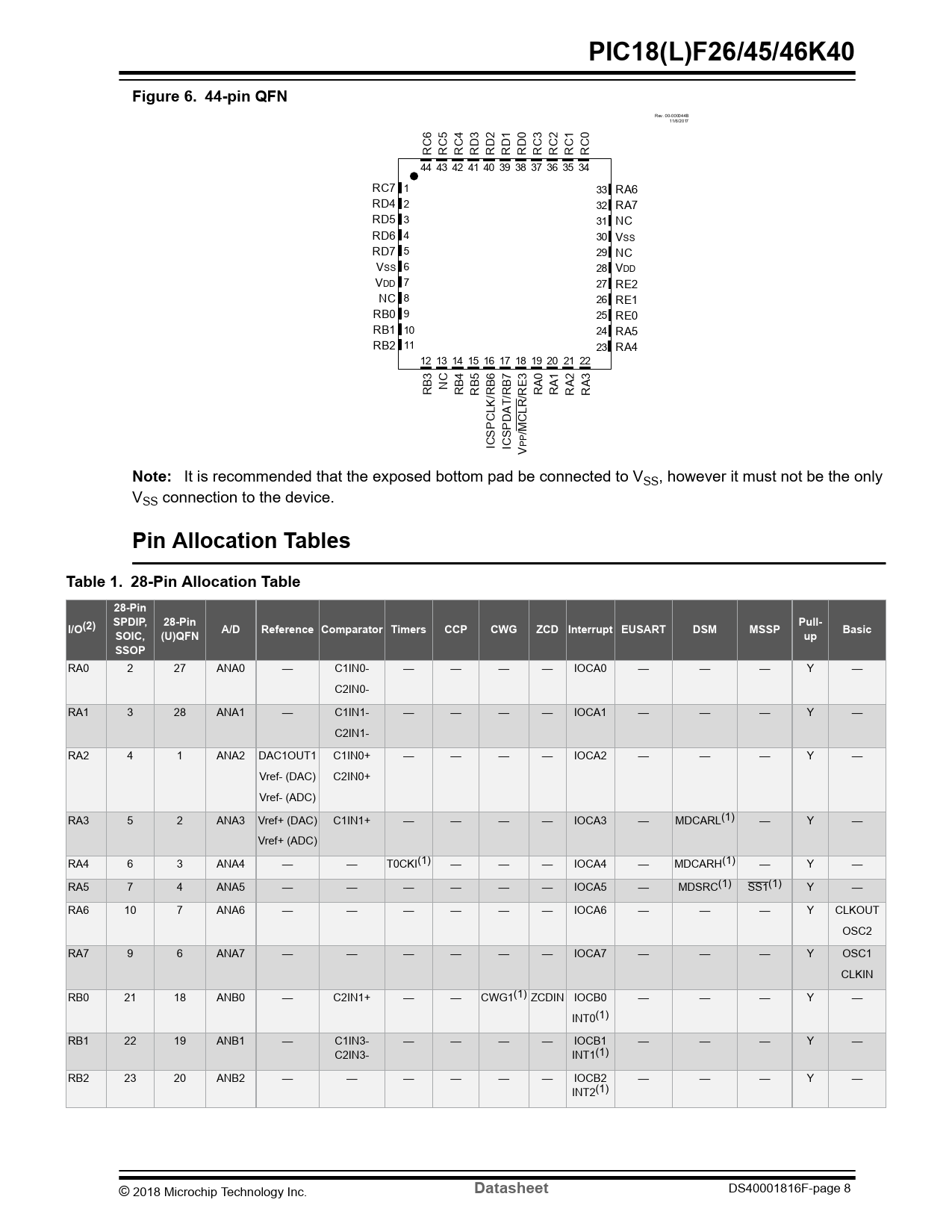 PIC18(L)F26/45/46K40. Figure 6. 44-pin QFN. Note: . Pin Allocation Tables. Table 1. 28-Pin Allocation Table. 28-Pin. SPDIP,. Pull-