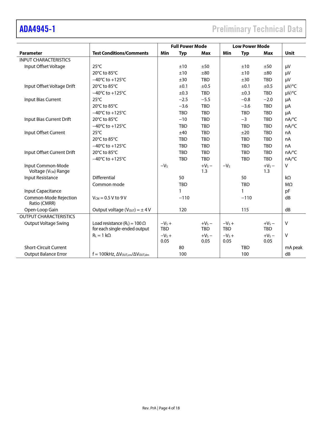 ADA4945-1. Preliminary Technical Data. Full Power Mode. Low Power Mode. Parameter. Test Conditions/Comments. Min. Typ Max Min. Typ Max