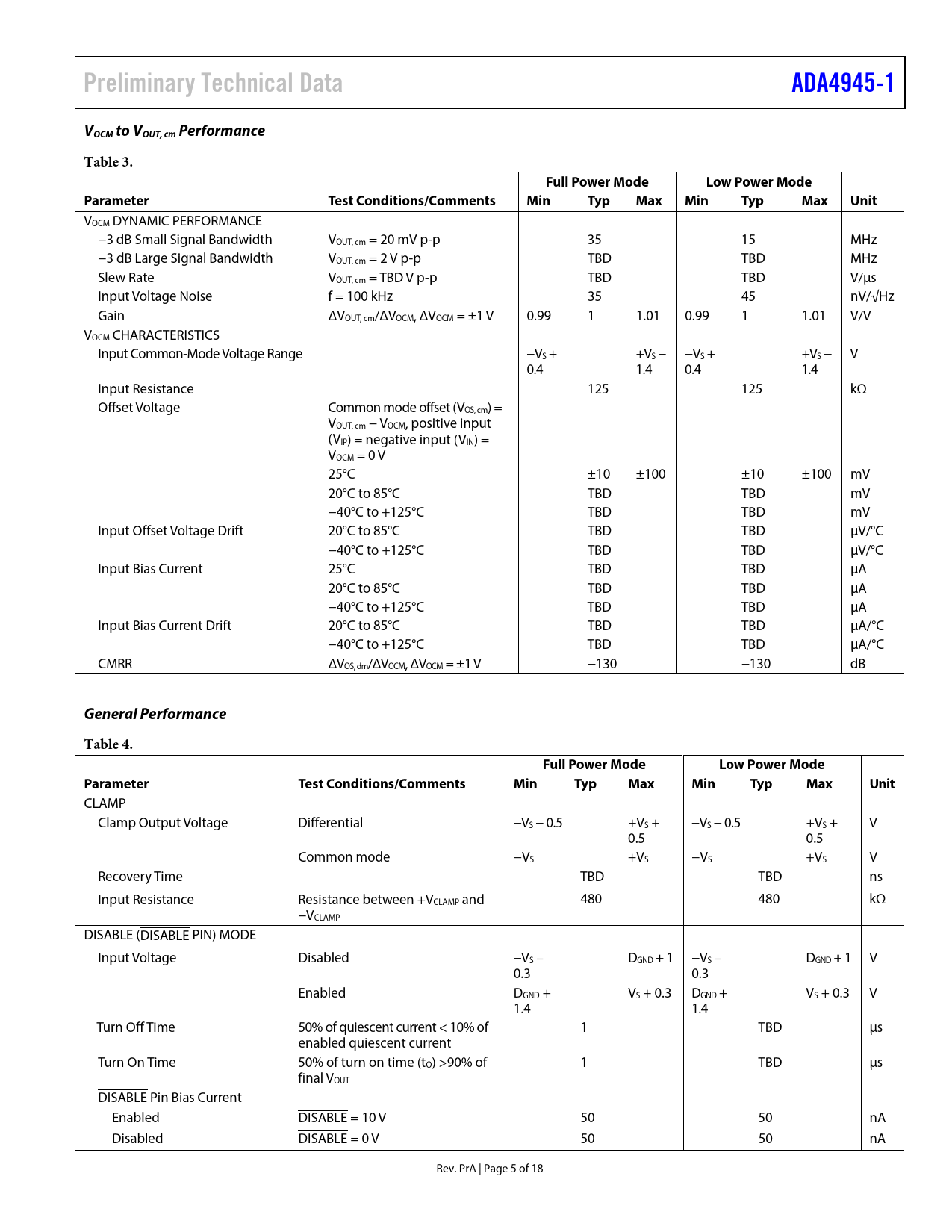 Preliminary Technical Data. ADA4945-1. VOCM to VOUT, cm Performance. Table 3. Full Power Mode. Low Power Mode. Parameter