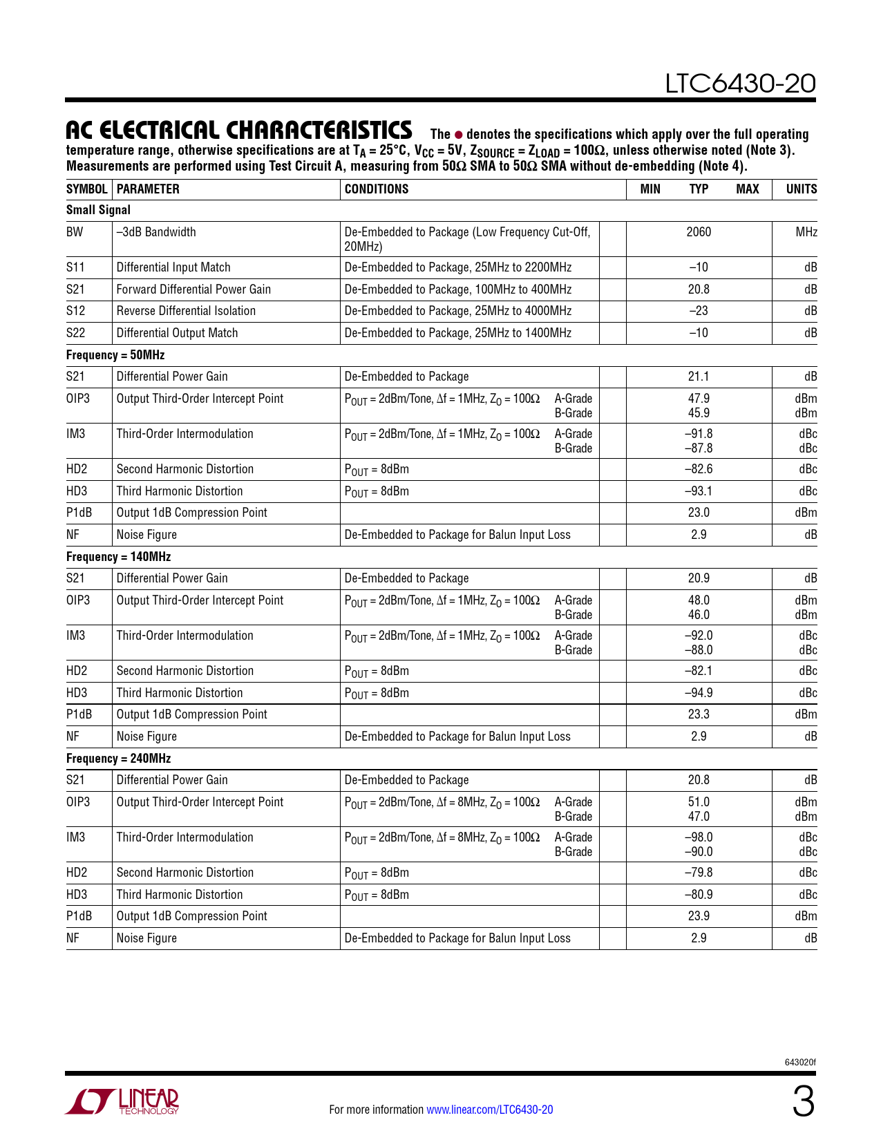 S21 Differential Power Gain De-Embedded to Package 20.8 dB OIP3 Output Third-Order Intercept Point POUT = 2dBm/Tone, Δf = 8MHz, ZO = 100Ω A-Grade 51.0 dBm B-Grade 47.0 dBm IM3 Third-Order Intermodulation POUT = 2dBm/Tone, Δf = 8MHz, ZO = 100Ω A-Grade –98.0 dBc B-Grade –90.0 dBc HD2 Second Harmonic Distortion POUT = 8dBm –79.8 dBc HD3 Third Harmonic Distortion POUT = 8dBm –80.9 dBc P1dB Output 1dB Compression Point 23.9 dBm NF Noise Figure De-Embedded to Package for Balun Input Loss 2.9 dB 643020f For more information www.linear.com/LTC6430-20 3 Document Outline Features Applications Description Typical Application Absolute Maximum Ratings Pin Configuration Order Information DC Electrical Characteristics AC Electrical Characteristics Typical Performance Characteristics Pin Functions Block Diagram Test Circuit A Operation Applications Information Differential S Parameters Typical Applications Package Description Typical Application Related Parts